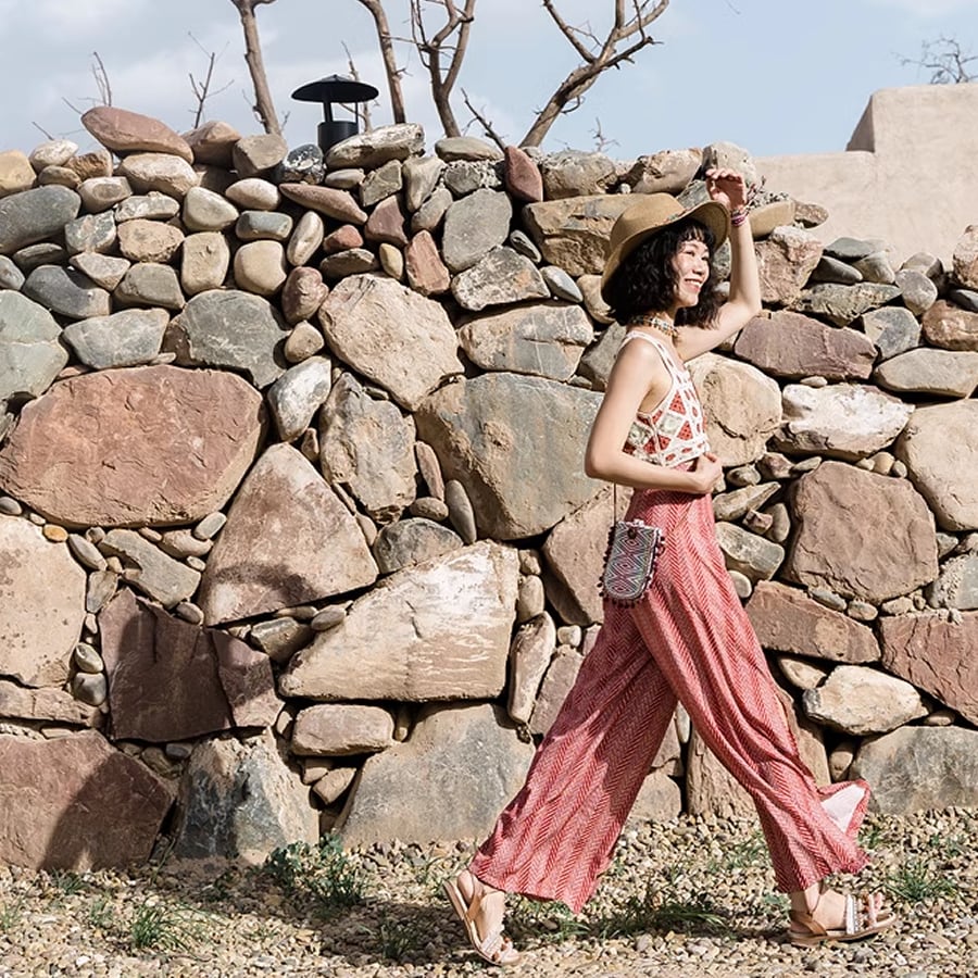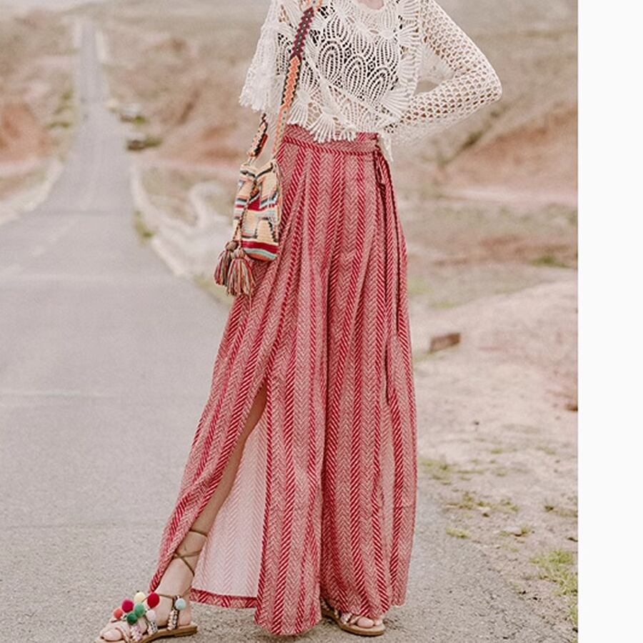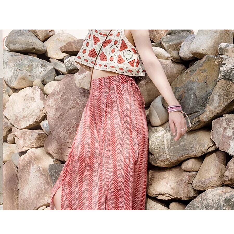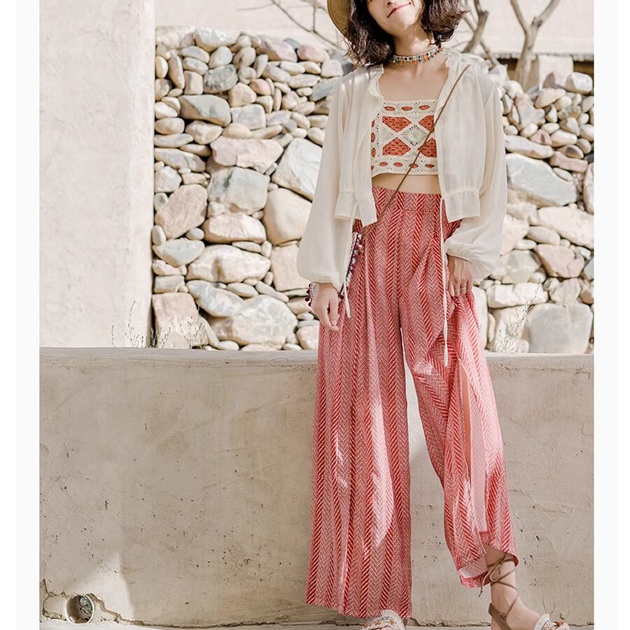 レディース エスニック柄 ワイドパンツ カジュアルパンツ フロントスリット S M L 赤 レッド AS11028