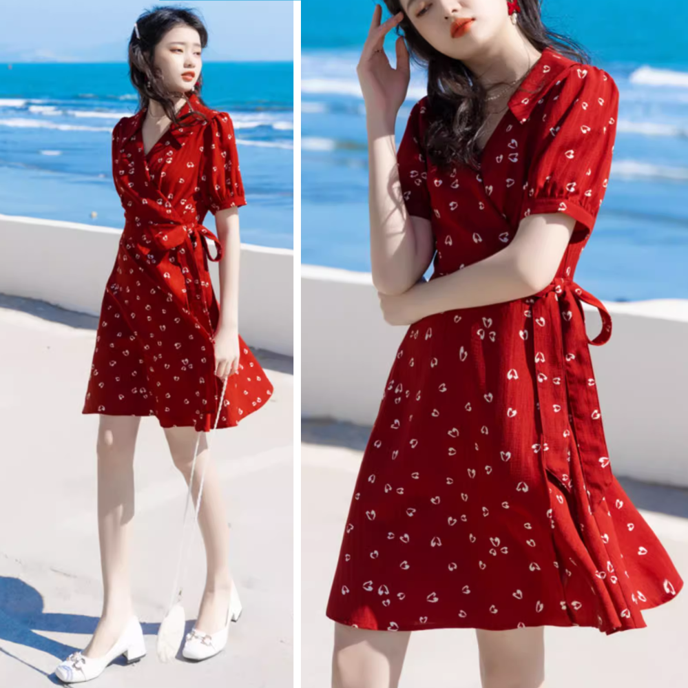 レディース 花柄 ワンピース ミニ丈 ハイウエスト Vネック 半袖 S M XL 赤 レッド AS11032