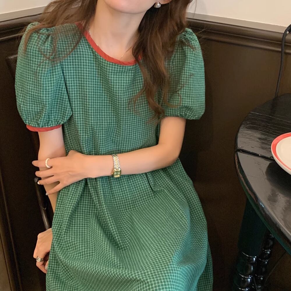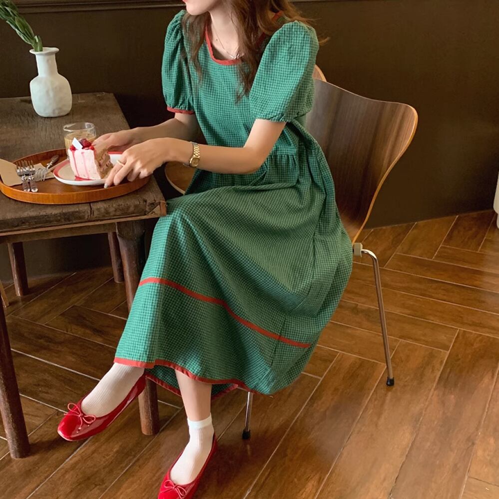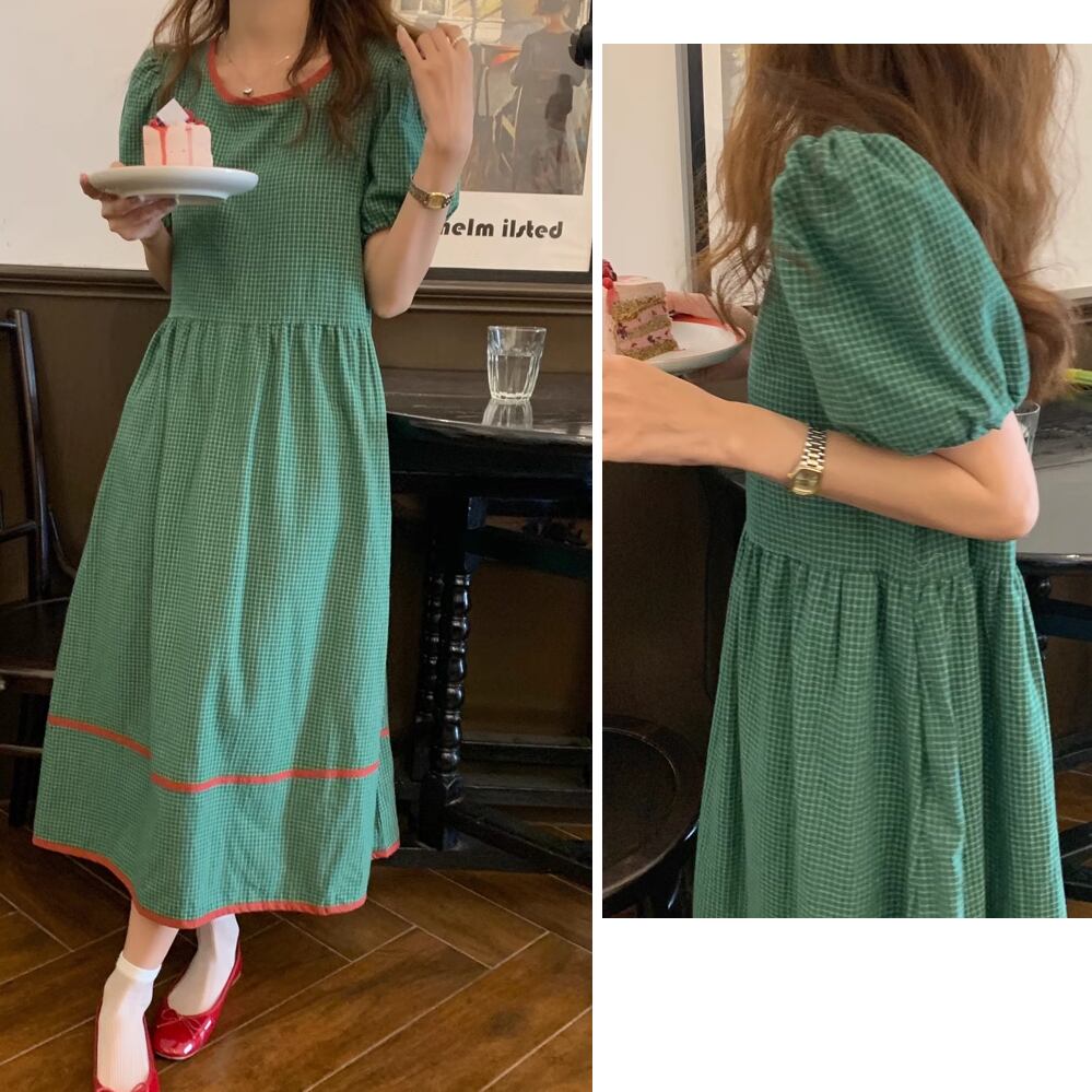 レディース チェック柄 ワンピース ロング丈 半袖 パフスリーブ レトロ グリーン AS11060
