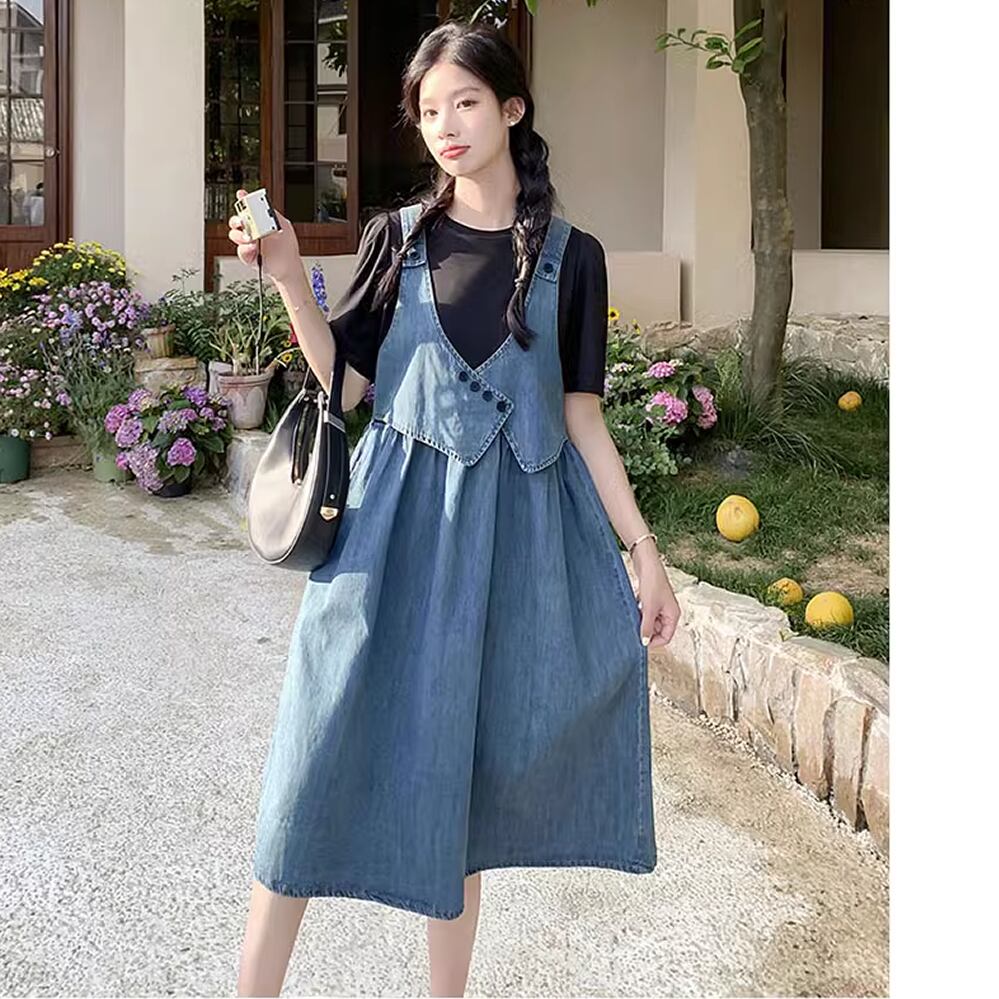 デニムジャンパースカート+半袖カットソーのドッキングデザインのワンピース。