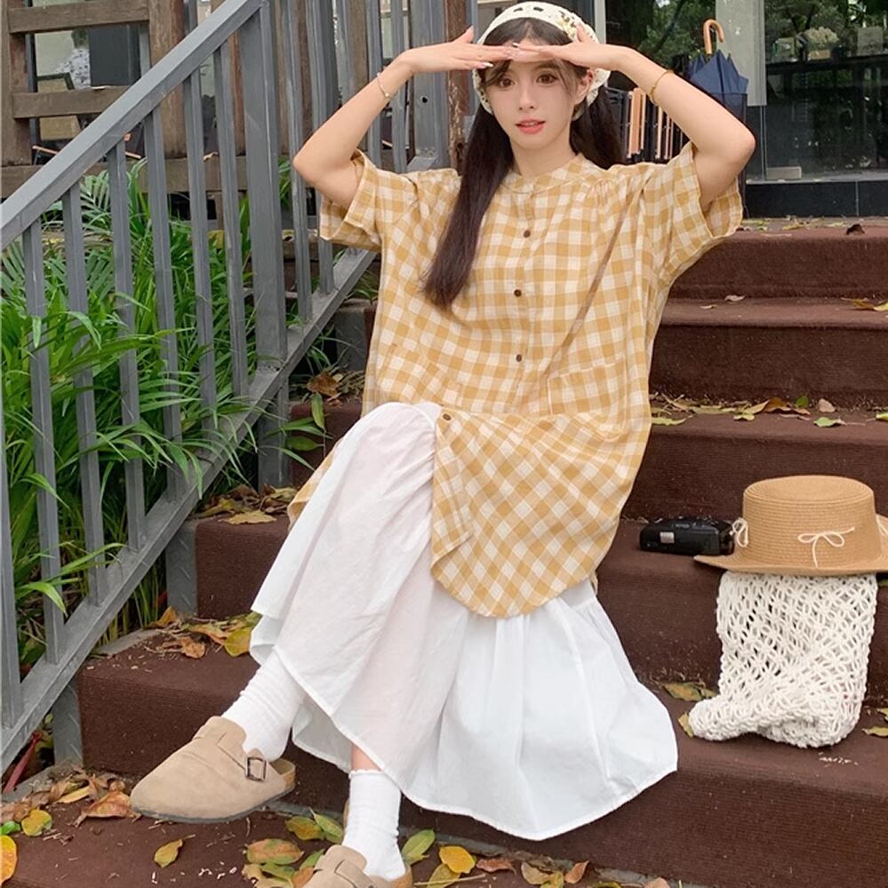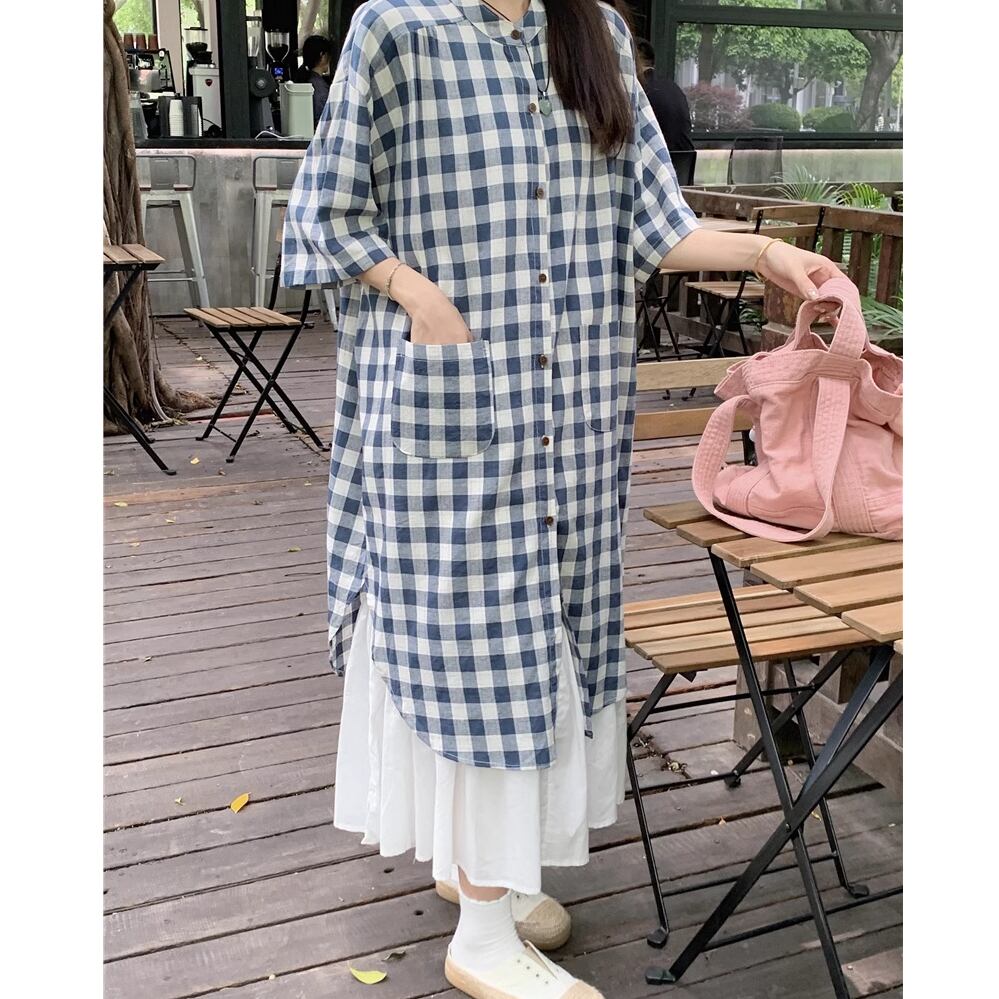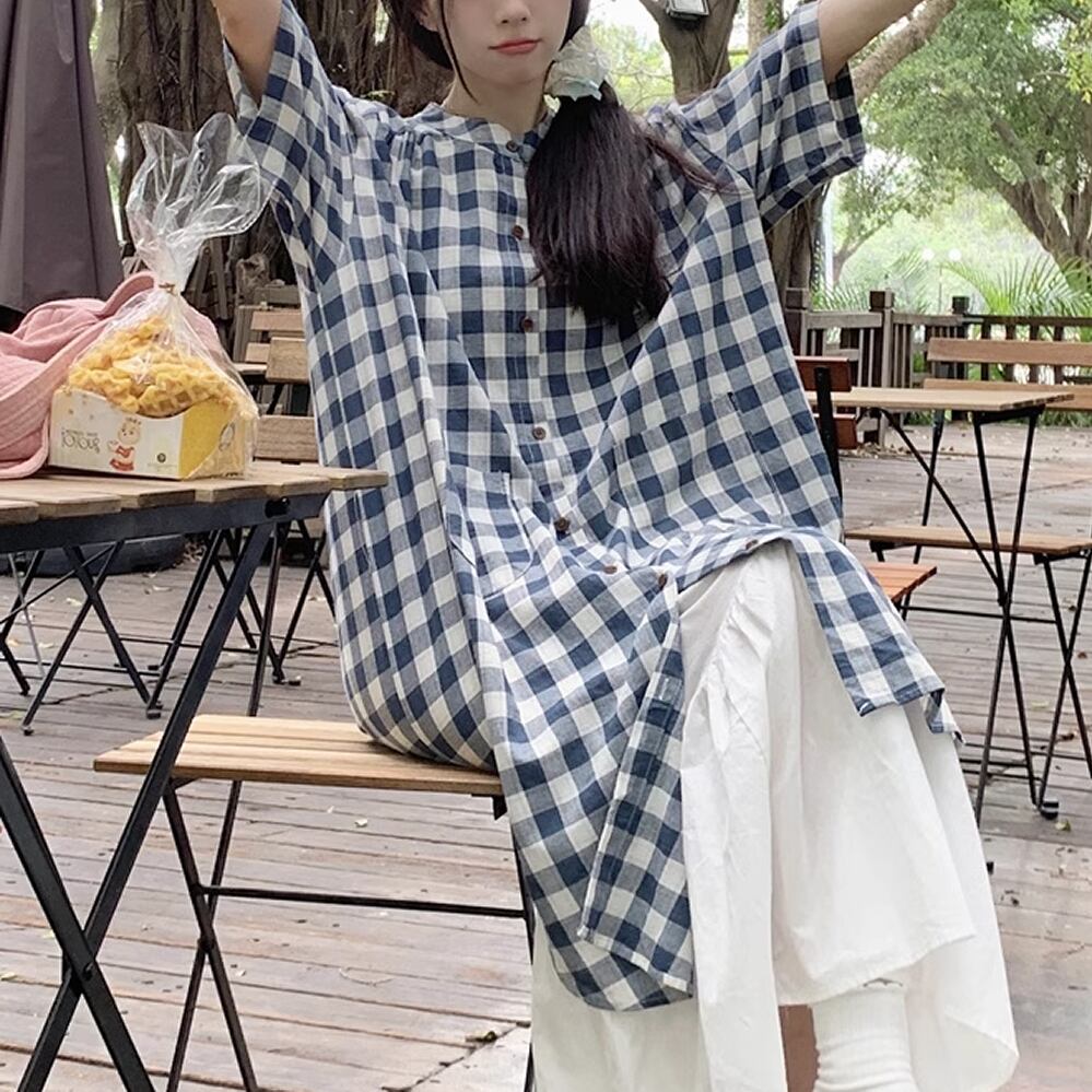 レディース チェック柄 シャツワンピース 半袖 ロング丈 ブルー イエロー AS11075