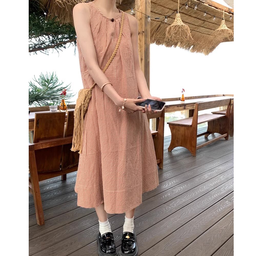 レディース ノースリーブワンピース チェック柄 ロング丈 レッド 赤 AS11076