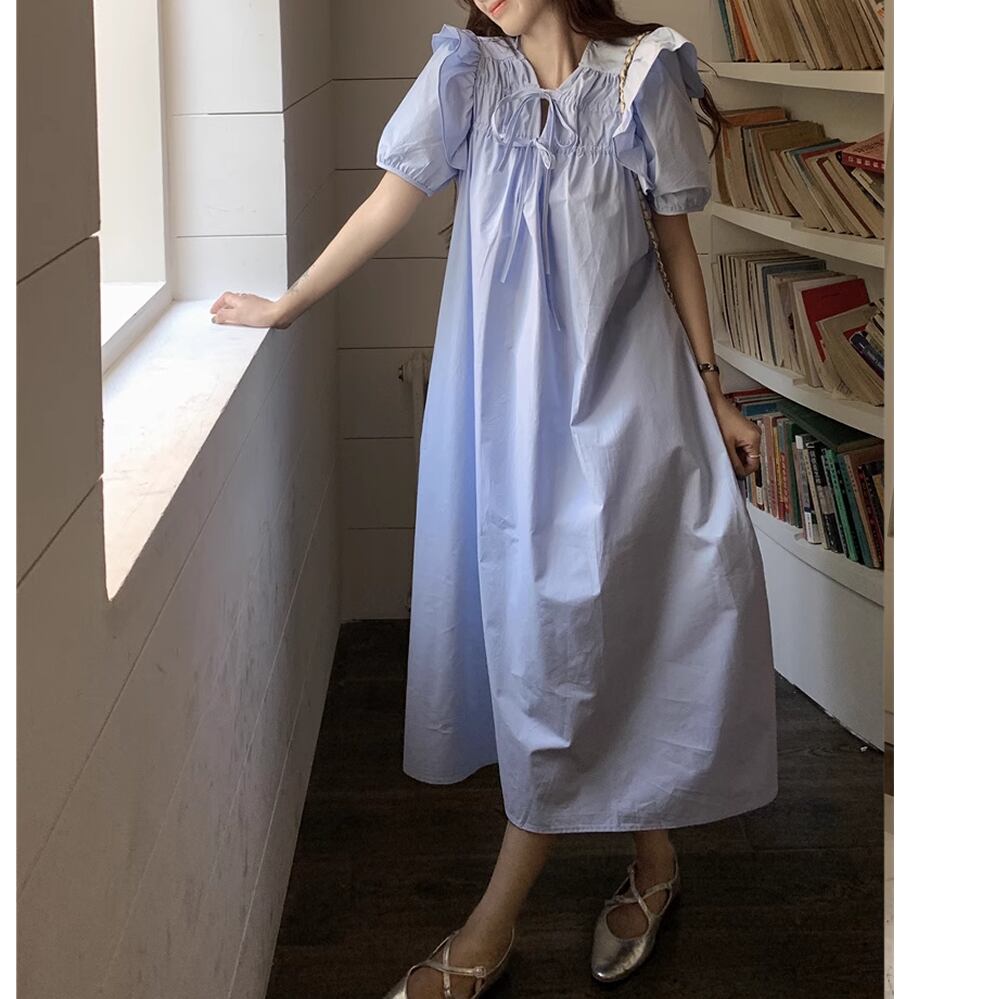 レディース 半袖 ワンピース ロング丈 フリル パフスリーブ S M L ブルー AS11088