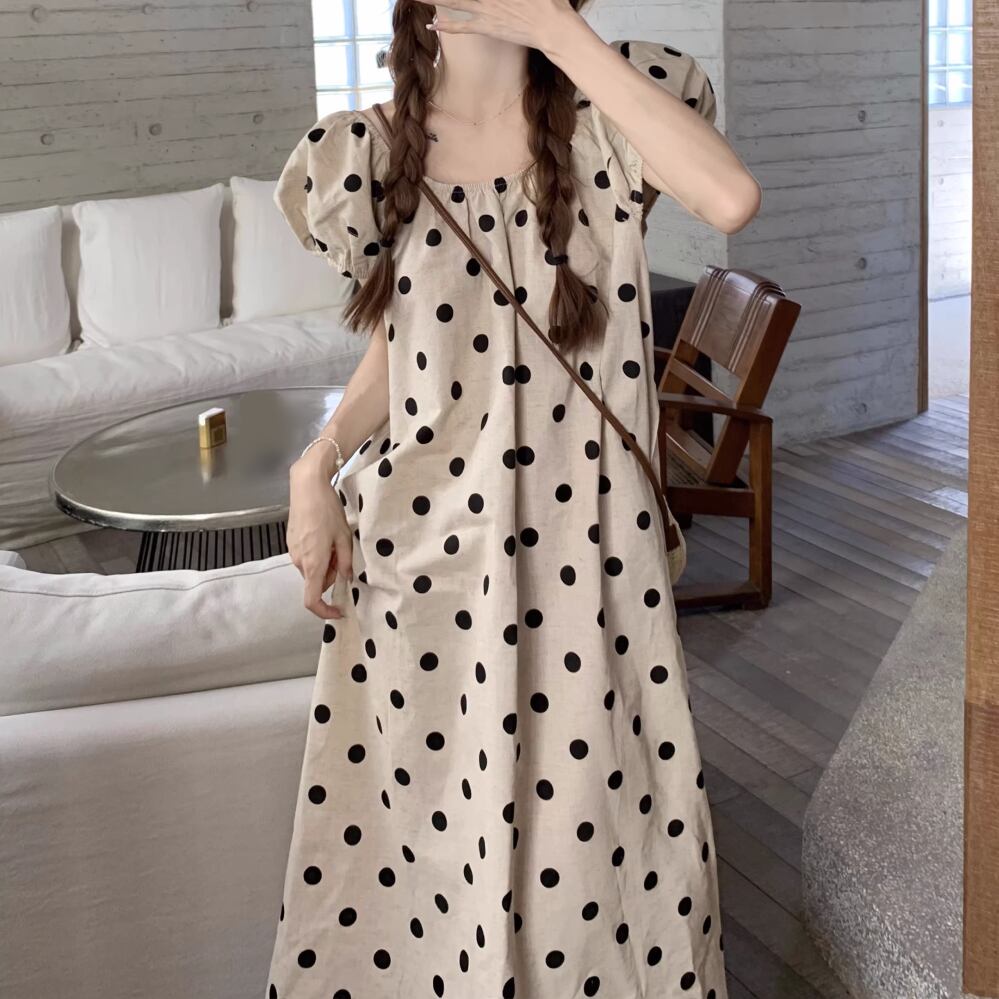 レディース ドット柄 半袖 ワンピース ロング丈 パフスリーブ S M L フレンチレトロ AS11089