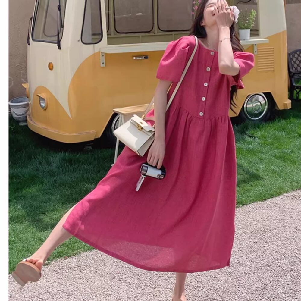 レディース 半袖 ワンピース ロング丈 サイドスリット パフスリーブS M L XL ローズレッド AS11109