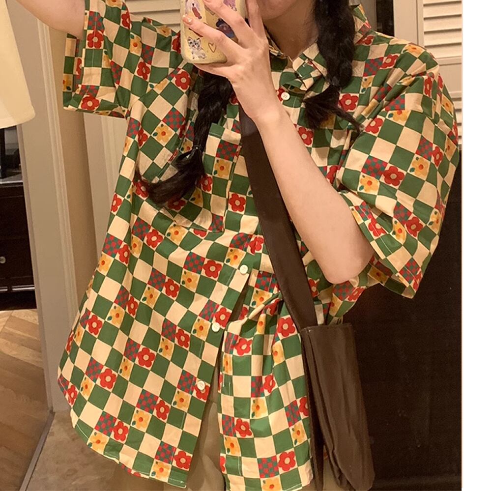 レディース シャツ 半袖 チェック柄 花柄 S M L XL 2XL レトロ AS11131