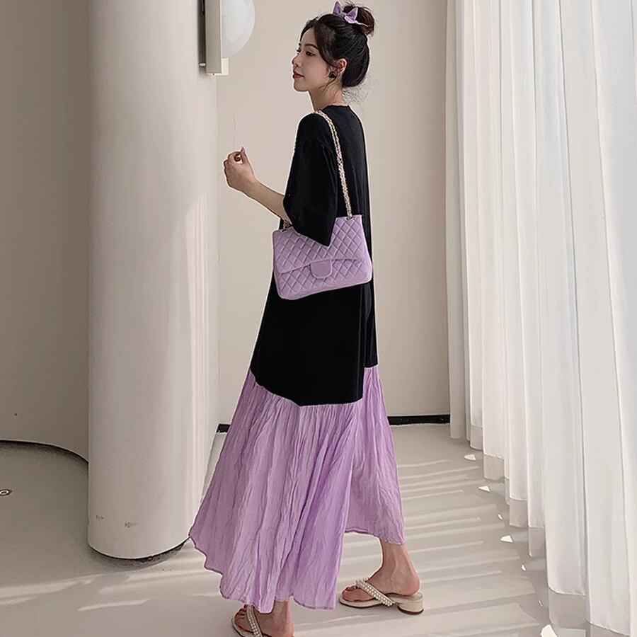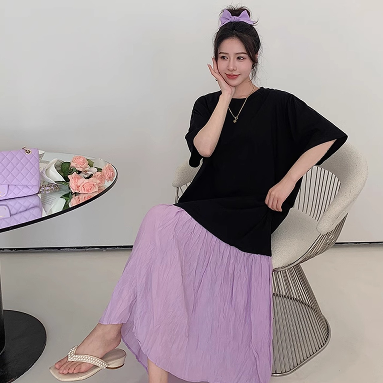 レディース 半袖 バイカラー ロング丈 ワンピース S M L XL 2XL 3XL 4XL ブラック パープル AS11153
