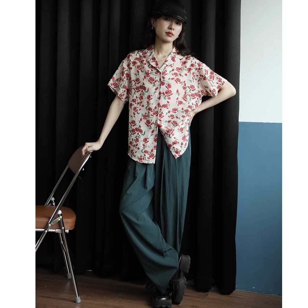 ローズ柄デザインの半袖シャツ。