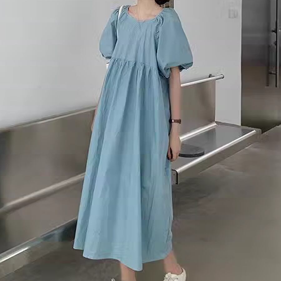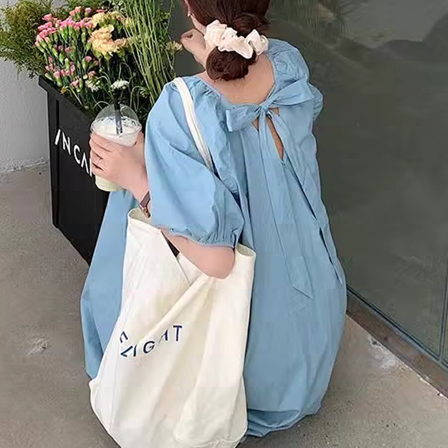 レディース 半袖 バックリボン パフスリーブ ワンピース ミモレ丈 M L XL 2XL ブルー AS11164