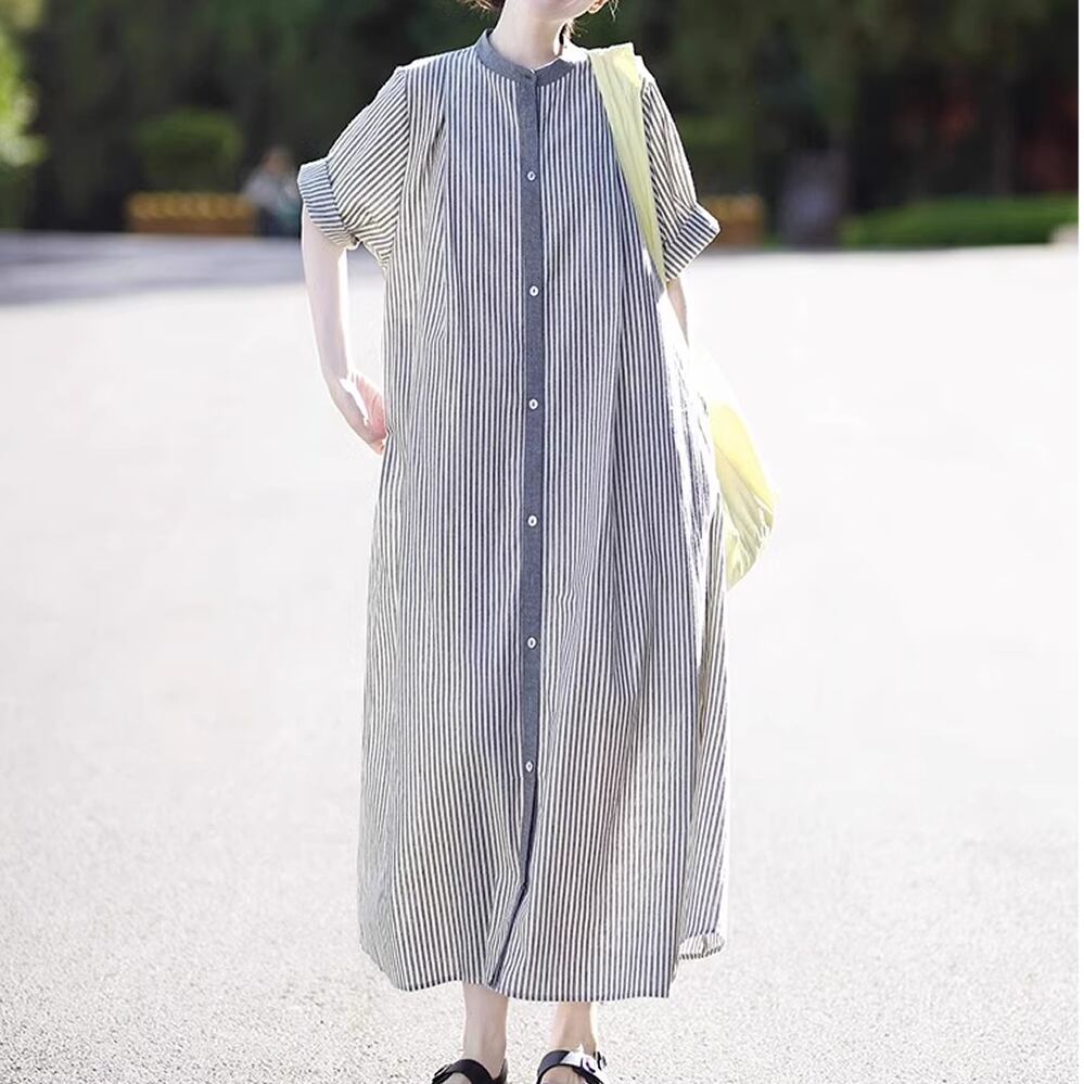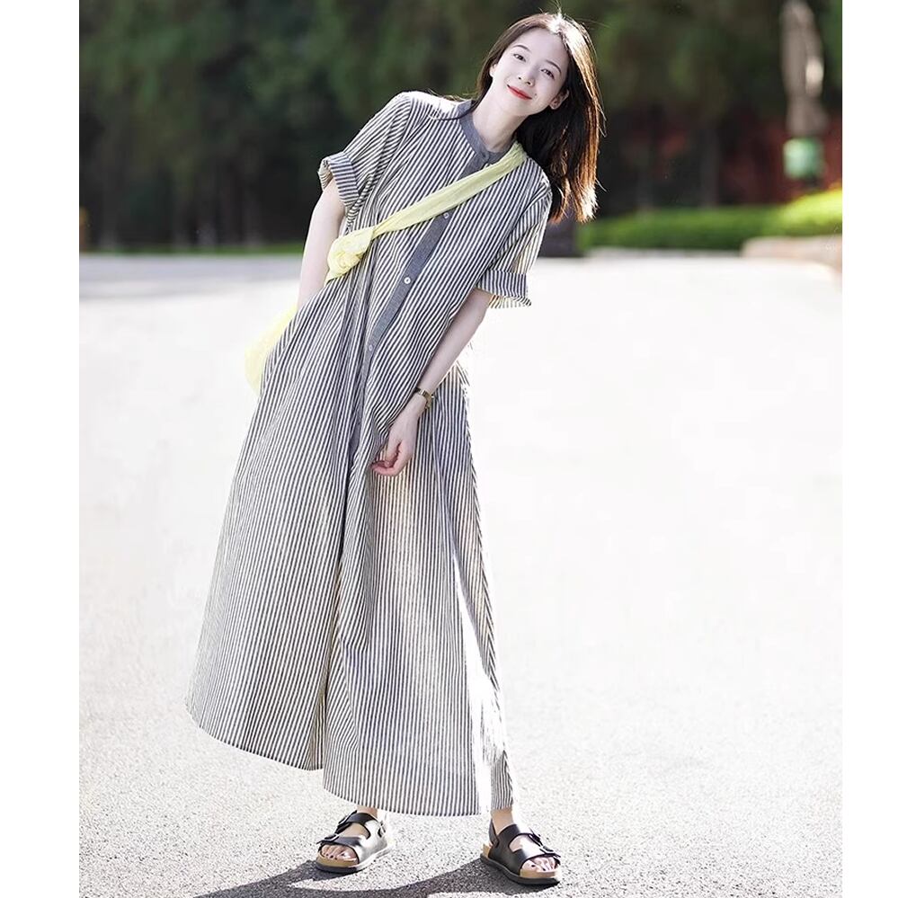 レディース ストライプ柄 半袖 ワンピース ロング丈 S M L XL オーバーシルエット AS11178