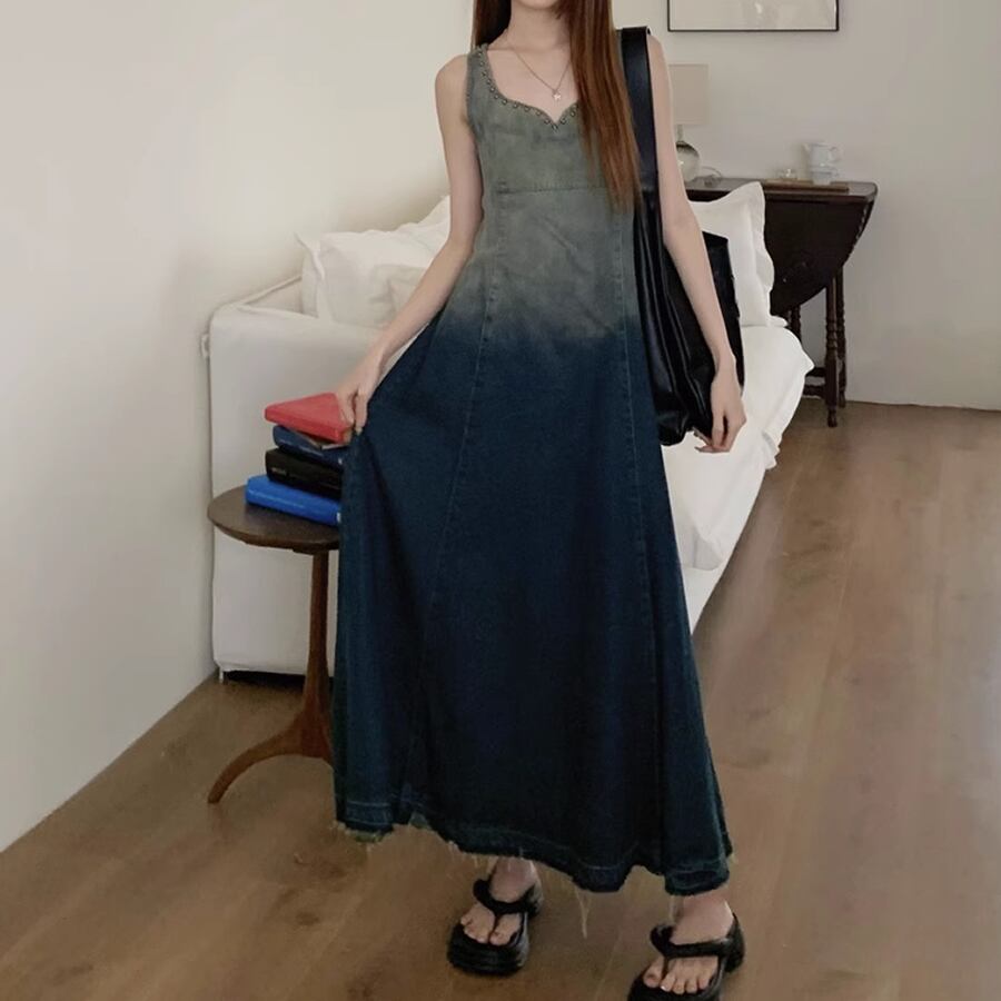 レディース デニム ノースリーブ グラデーション ワンピース S M L ロング丈 AS11203
