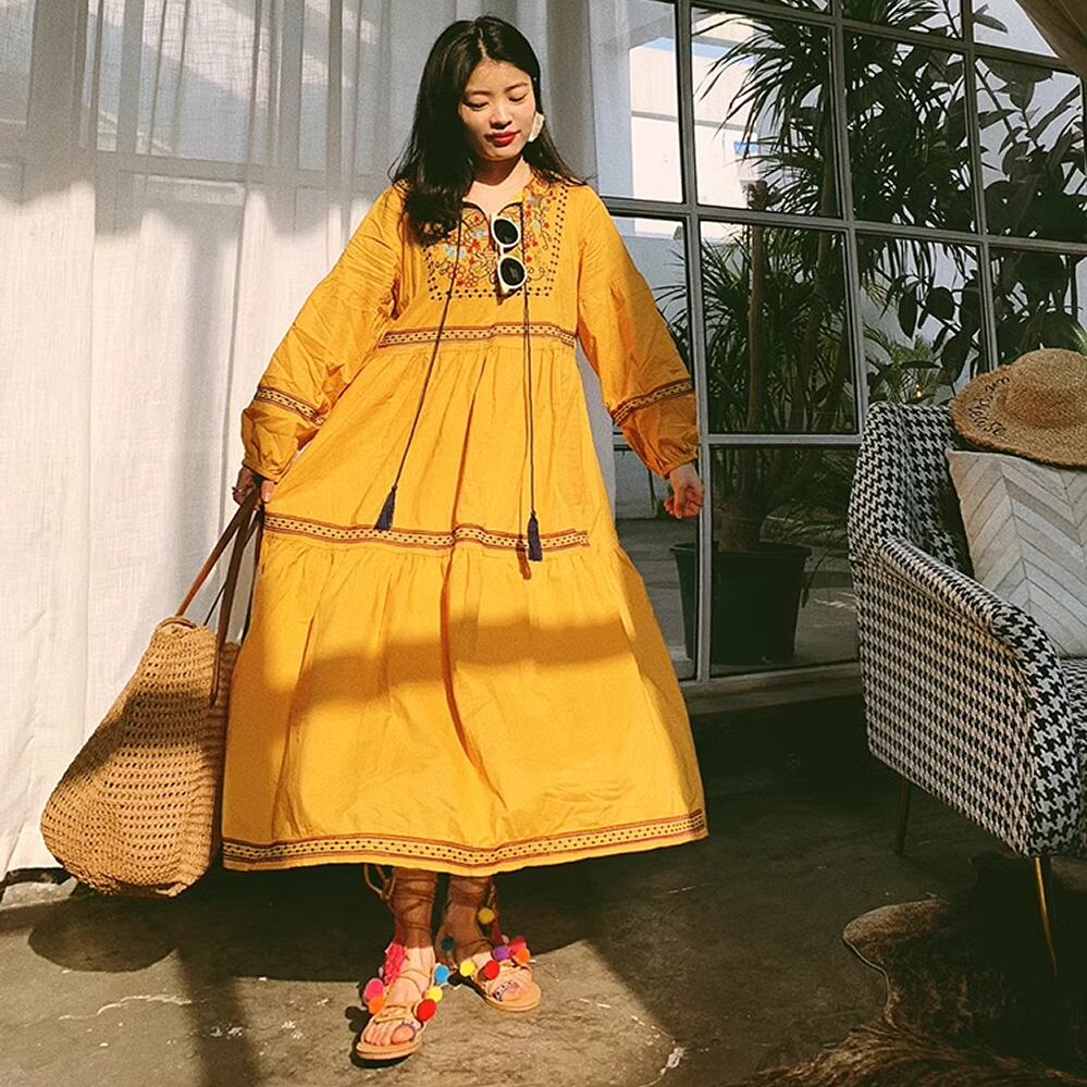 レディース エスニック風 長袖 ロングワンピース イエロー AS11209