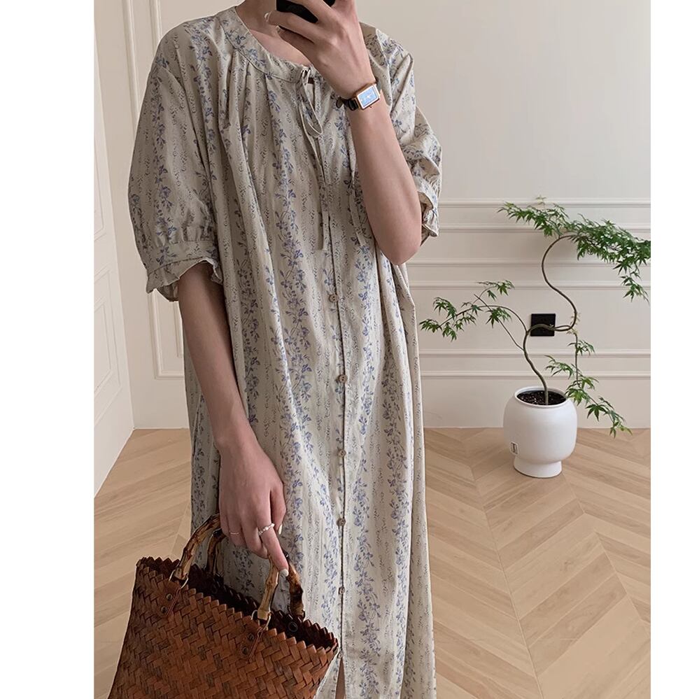 レディース 半袖 花柄 ロングワンピース コットンリネン ブルー AS11213