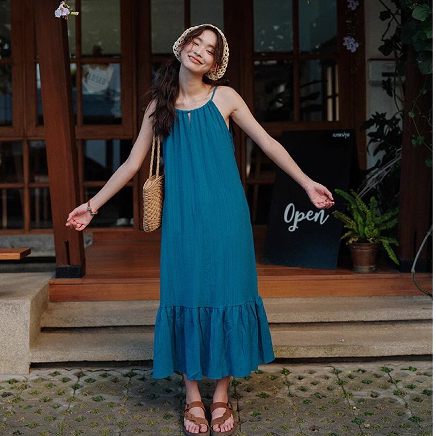 レディース キャミソールワンピース ロング丈 ブルー AS11217