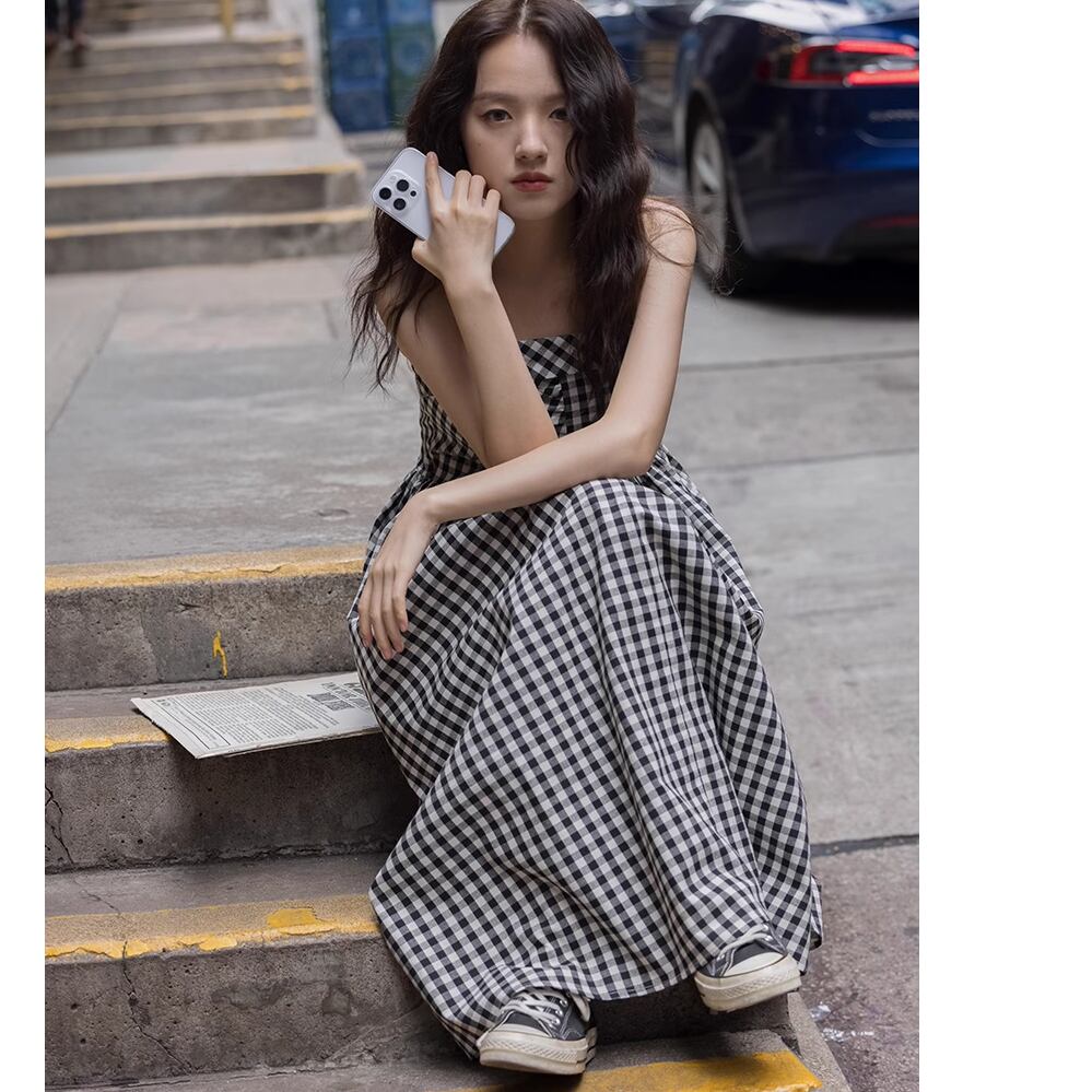 レディース チェック柄 キャミソールワンピース ミモレ丈 S M レトロ 白黒 モノトーン AS11220