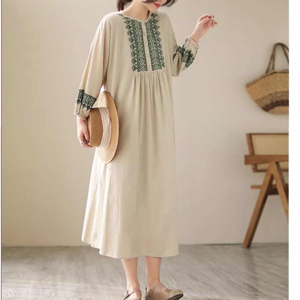 レディース エスニック風 長袖 ワンピース ロング丈 M L XL 2XL ベージュ AS11229