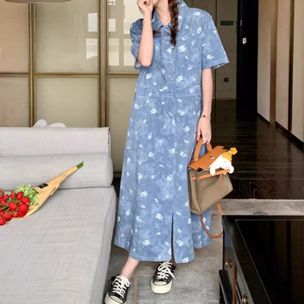 レディース 半袖 花柄 デニム シャツワンピース ロング丈 S M L XL ブルー AS11234