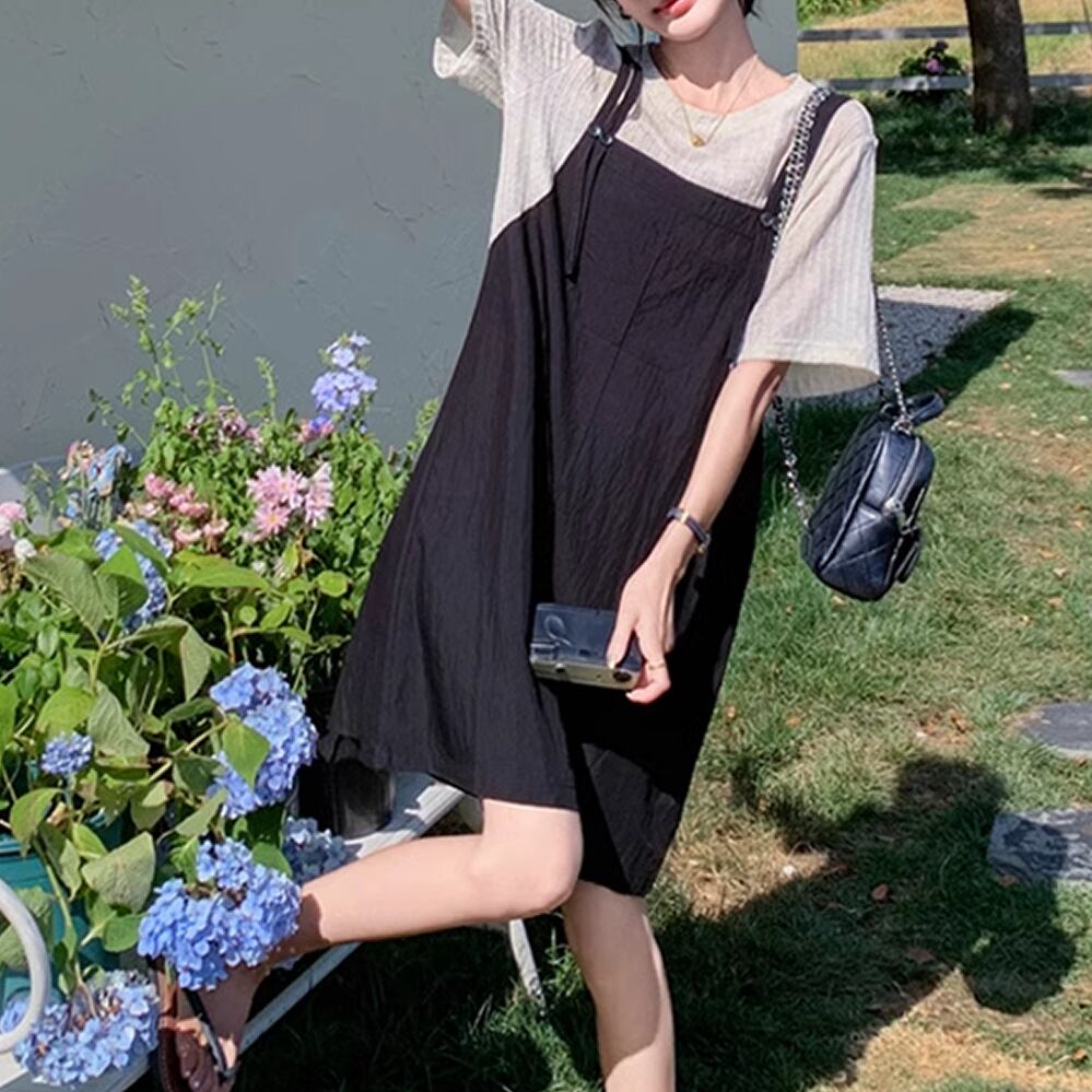 レディース 半袖 ドッキングワンピース ひざ丈 S M L XL ブラック AS11235