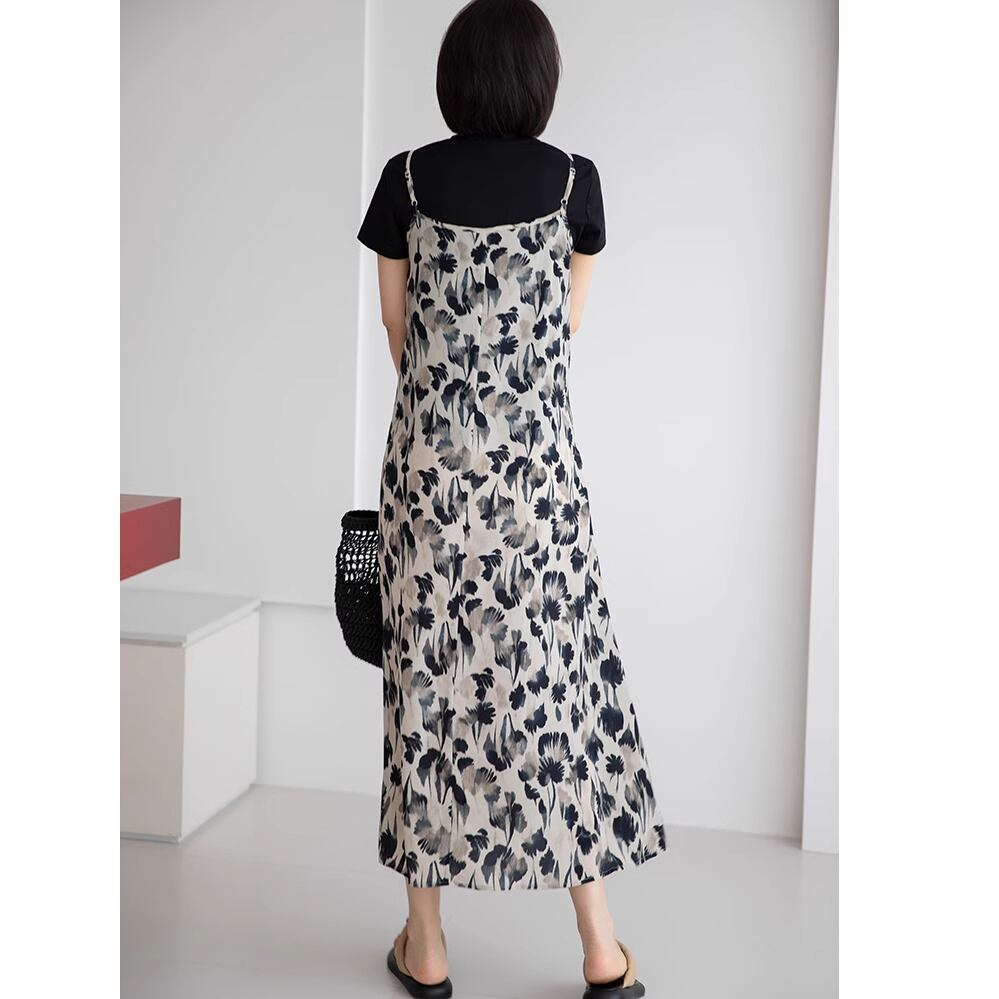 レディース 花柄 キャミソールワンピース ロング丈 M L XL 白黒 モノトーン AS11245