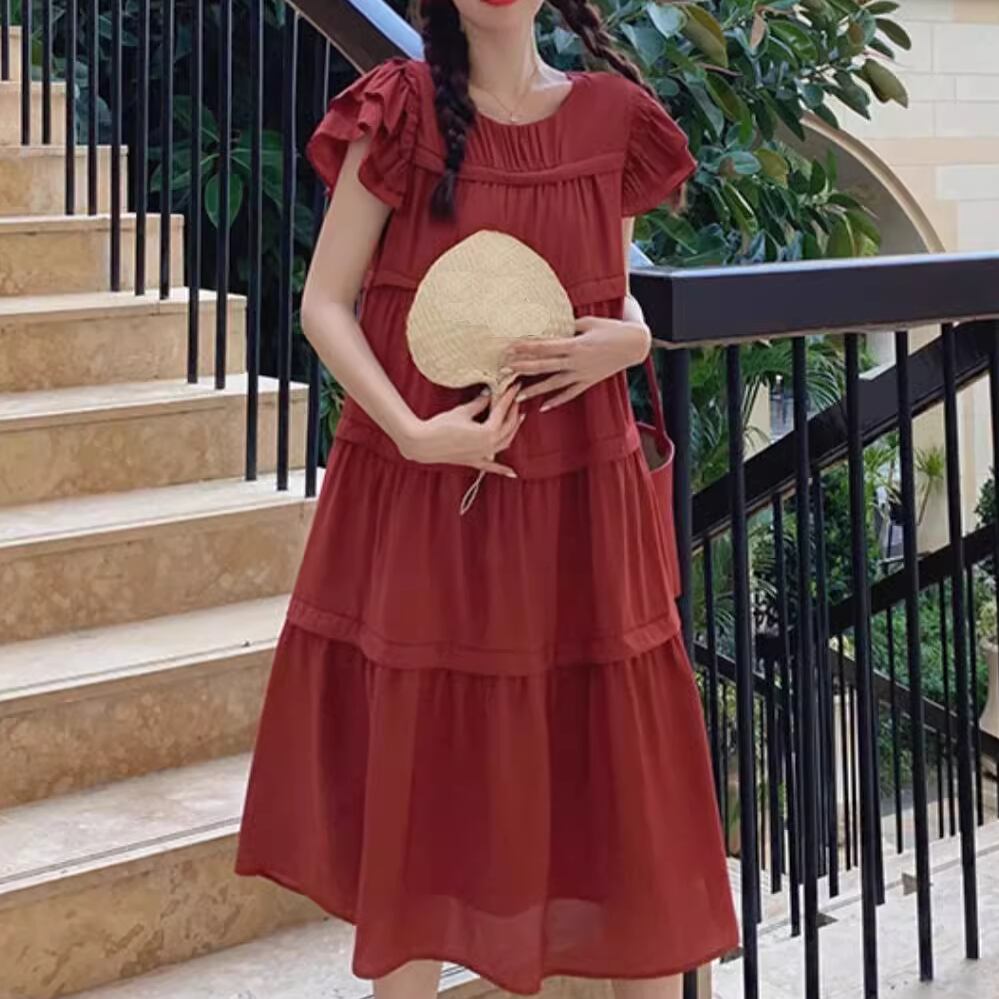レディース 半袖 ワンピース ロング丈 ティアード フリル S M L XL レッド AS11249