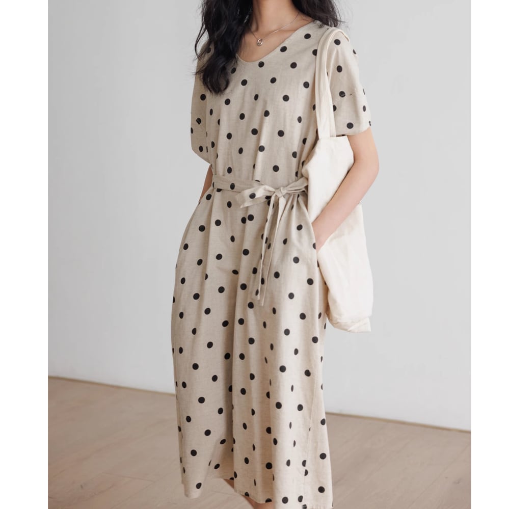 レディース ドット柄 ワンピース コットンリネン S M L ロング丈 半袖 アプリコット AS11264