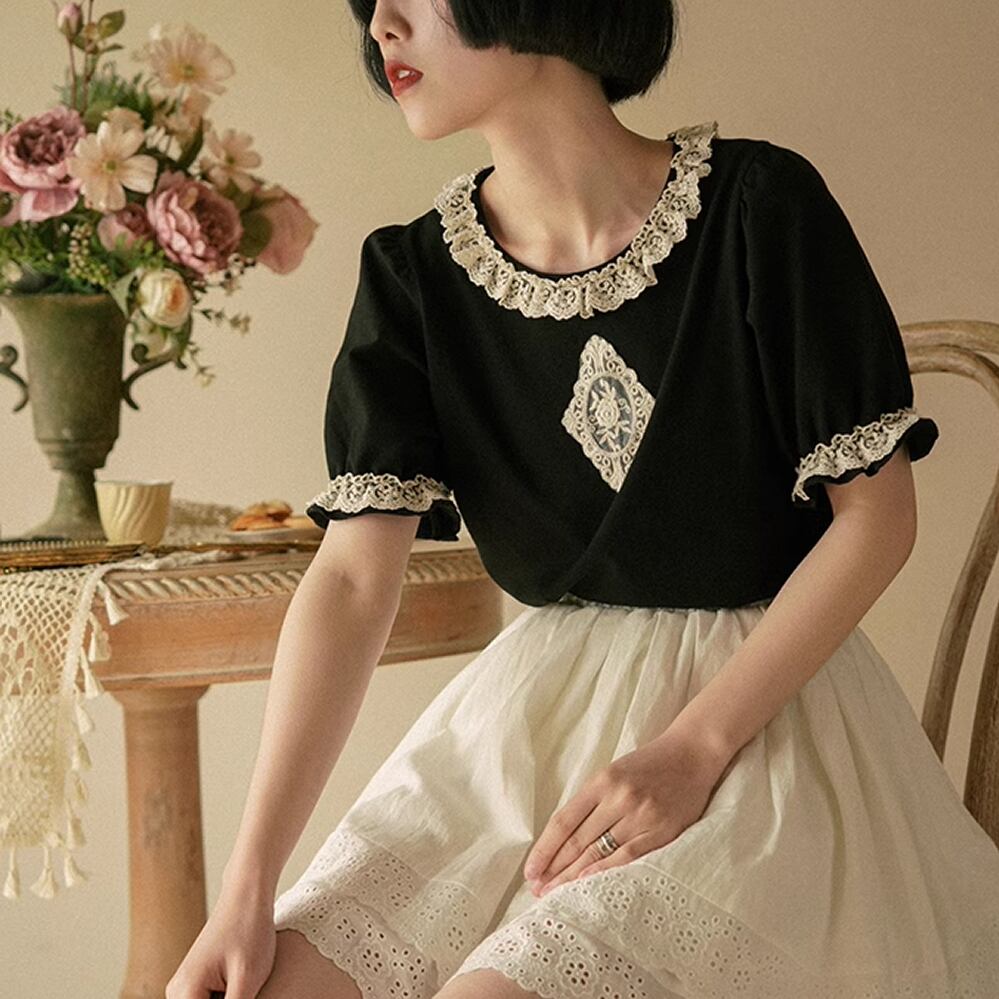 レディース フリル 半袖 トップス ショート丈 ブラック AS11300