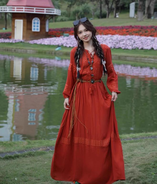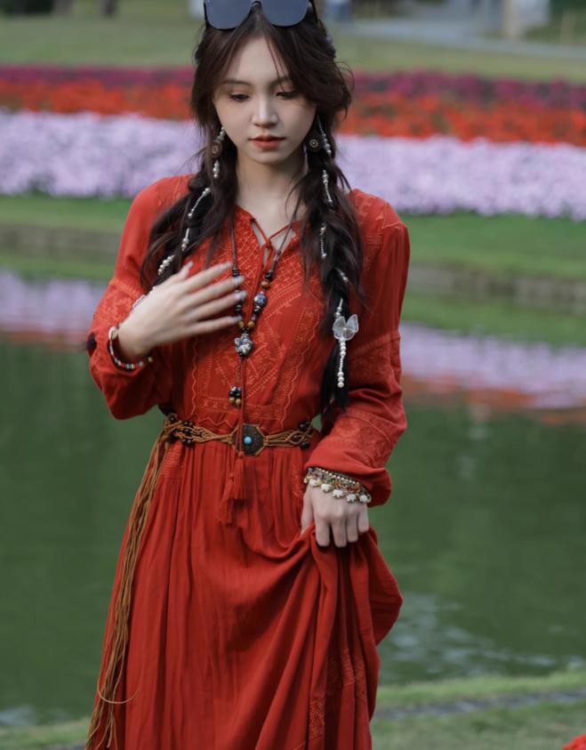 レディース エスニック風 ワンピース ロングスカート ボヘミアンスタイル 民族衣装風 レトロドレス 個性的ファッション ベルト付き KS10383