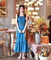 Aラインのサスペンダーロングスカートとベルトがセットになった、ボヘミアンでエスニックなスタイルを演出する2点セット。