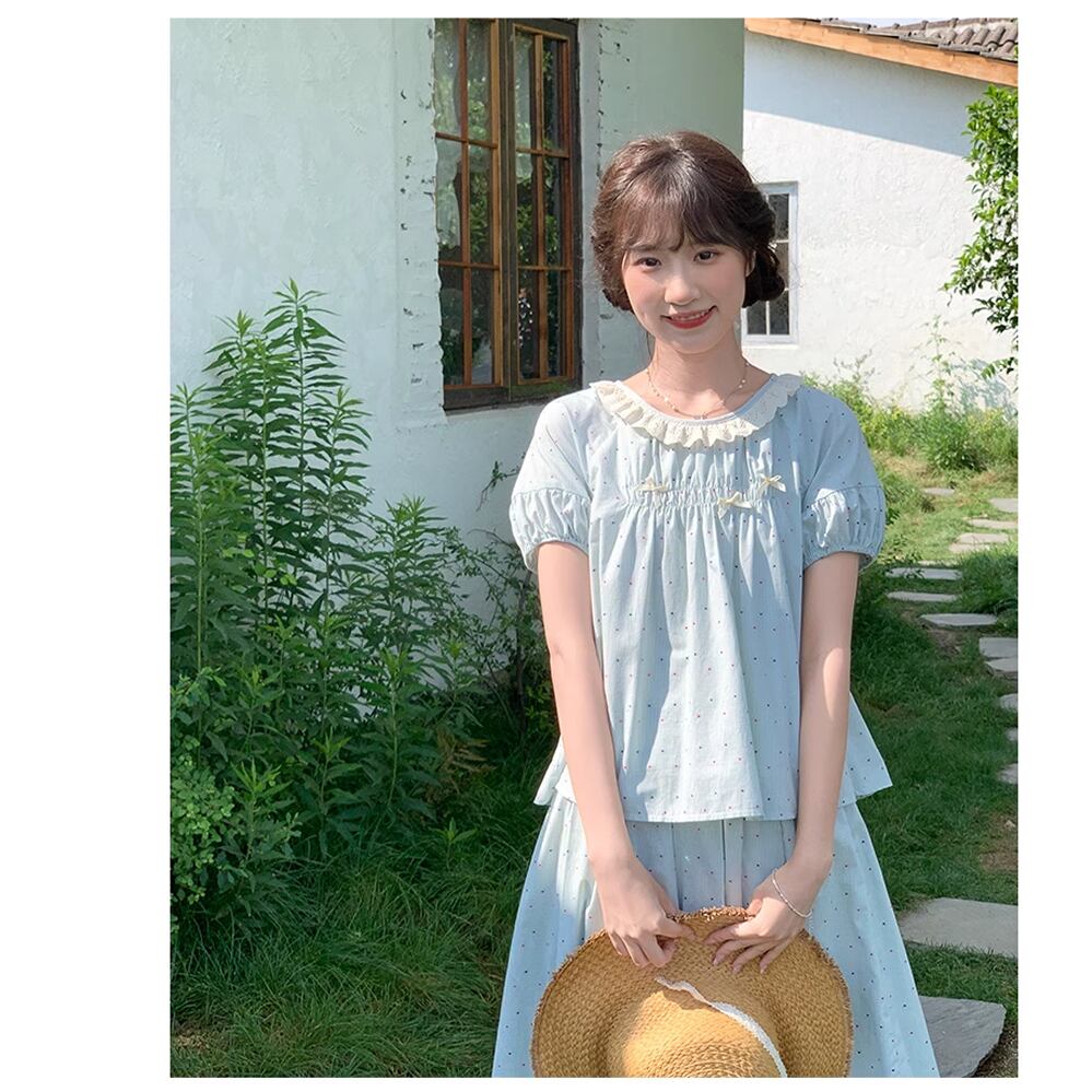 レディース ブラウス 水玉 ドット柄 フリル リボン パフスリーブ 半袖 S M L ブルー AS11316