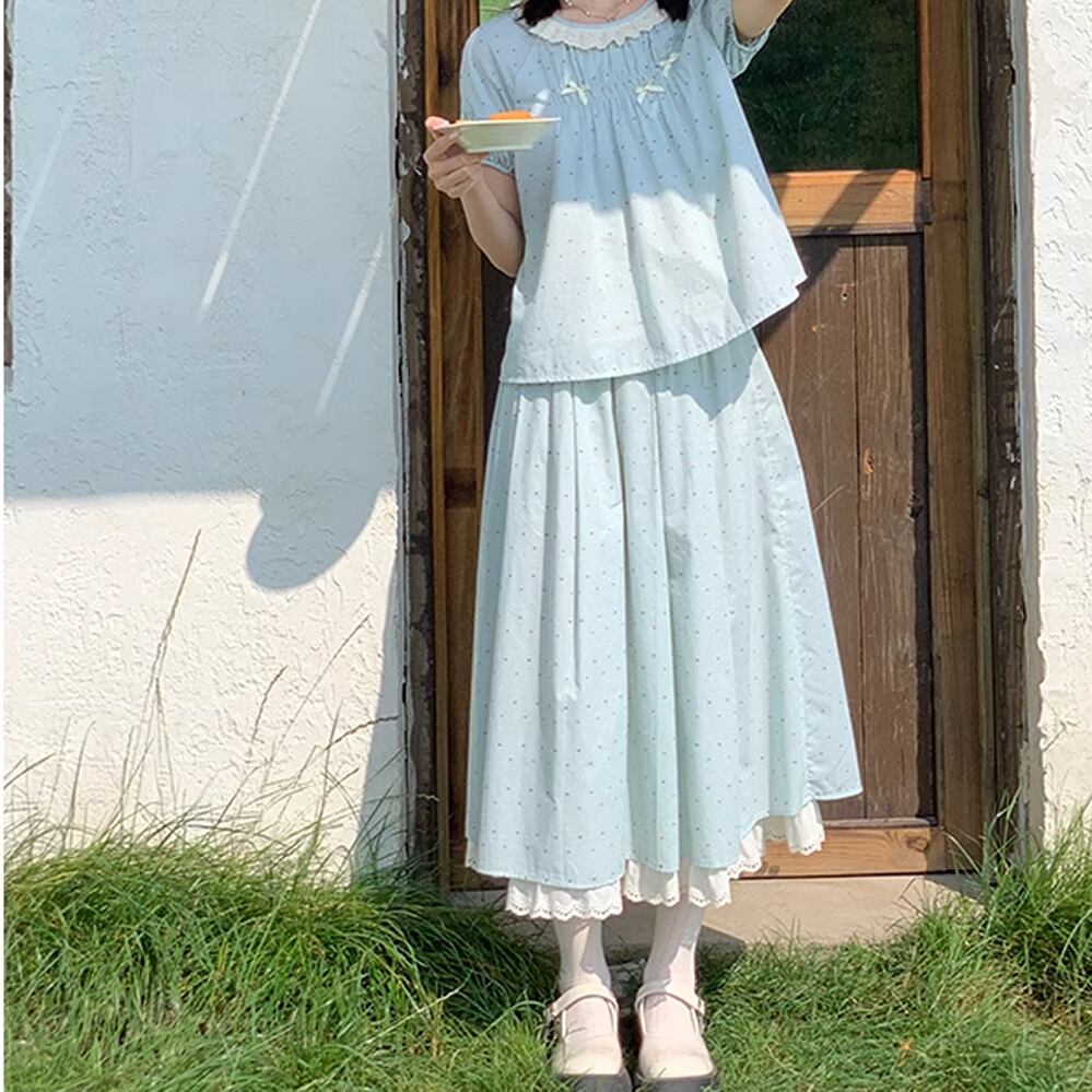 レディース ロングスカート フリル 水玉 ドット柄 S M L ブルー AS11317