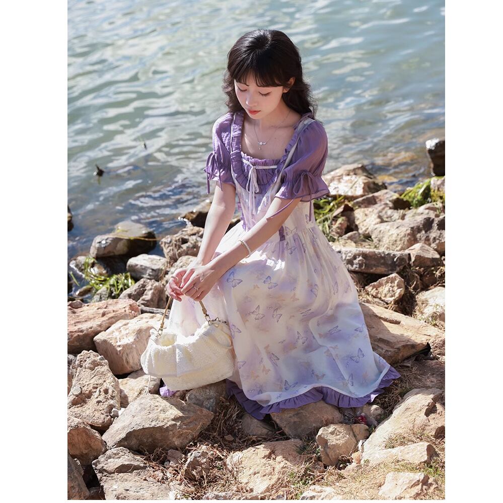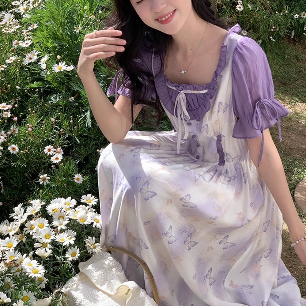 レディース 半袖 ロングワンピース バタフライ柄 蝶柄 フリル リボン S M パープル AS11318