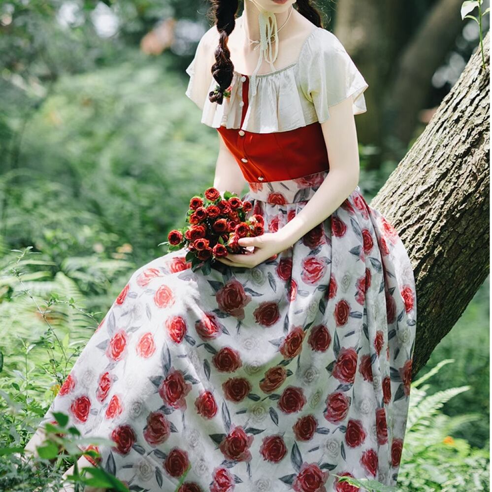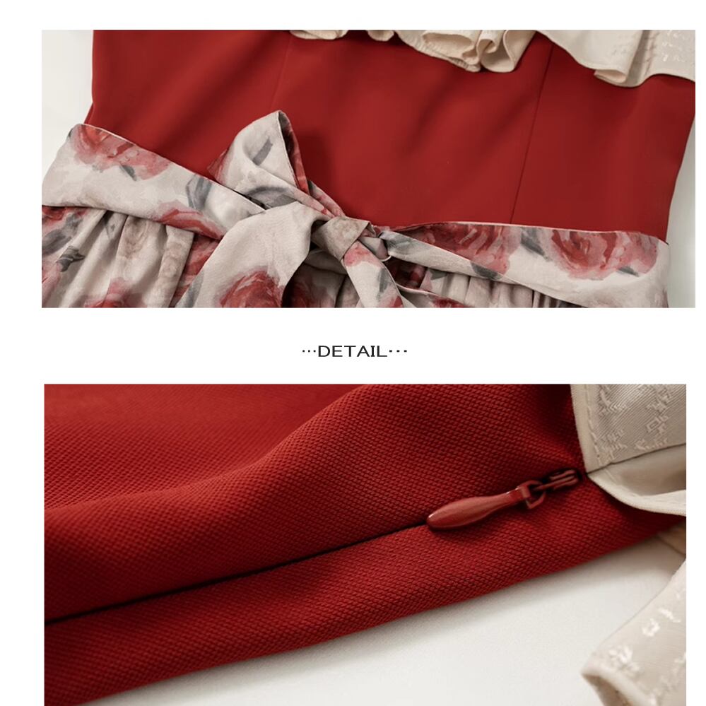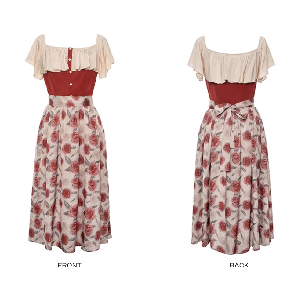 レディース 半袖 バラ柄 花柄 ワンピース ロング丈 S M L XL 2XL 赤 レッド AS11337