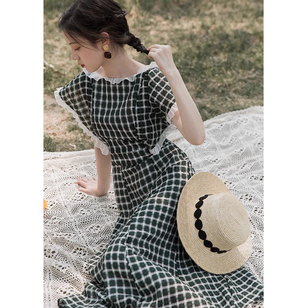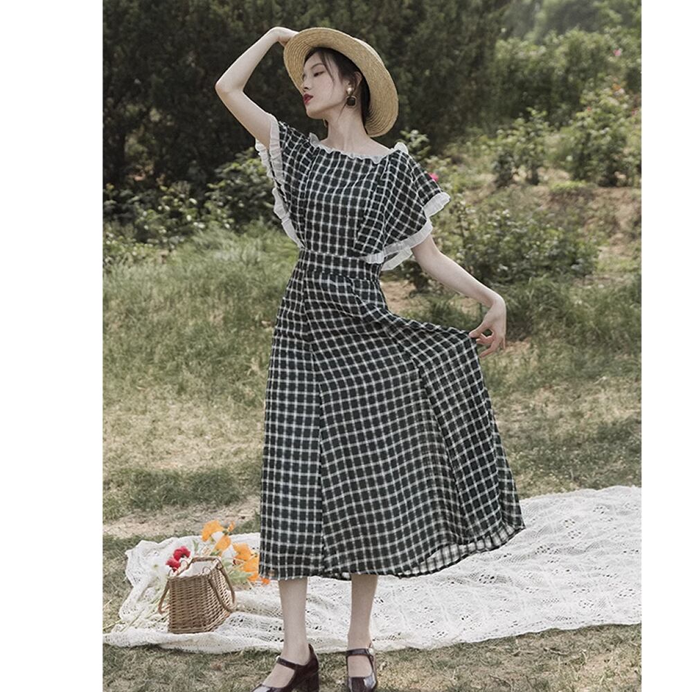 レディース チェック柄 半袖 ロングワンピース フリル S M L レトロガーリー AS11339