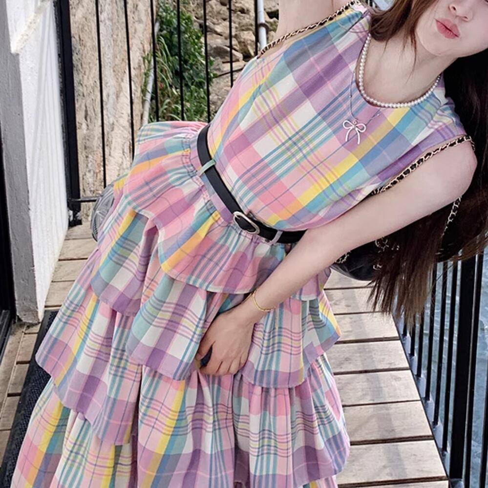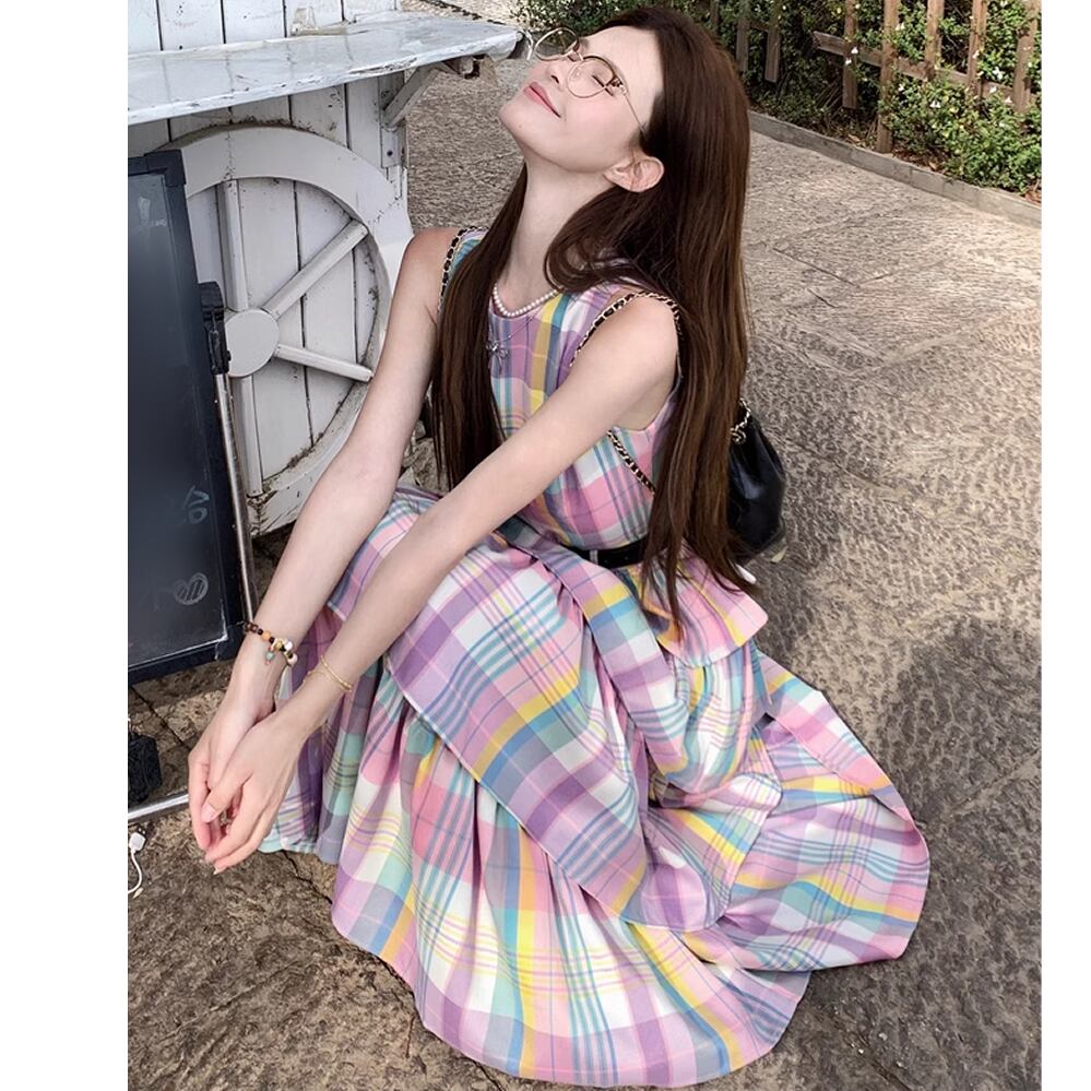 レディース チェック柄 ノースリーブ ロングワンピース S M L レトロガーリー カラフル AS11340