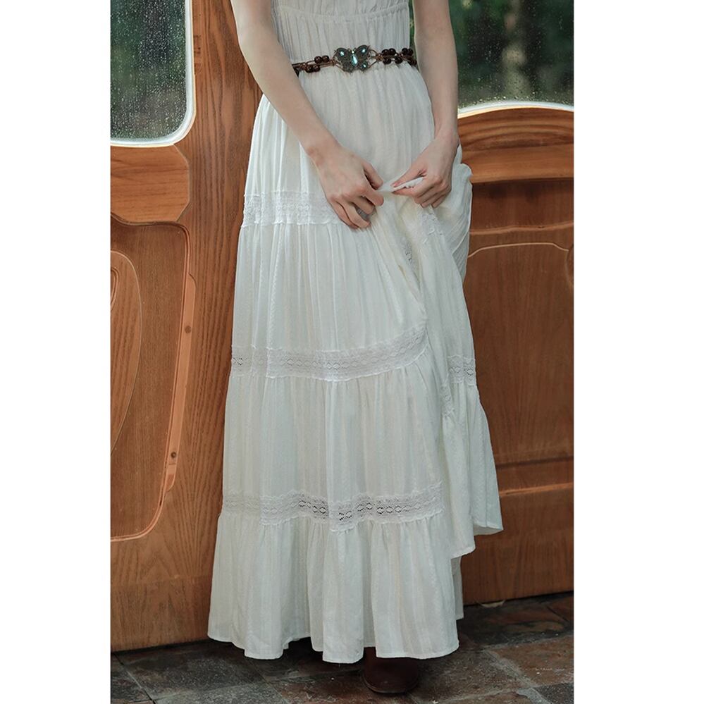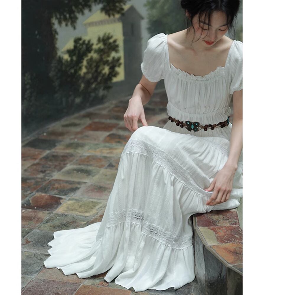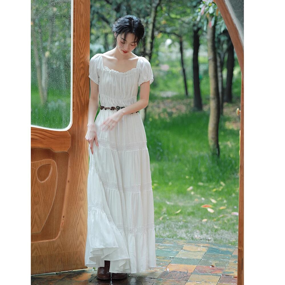 レディース 半袖 ティアード ロングワンピース S M フレンチレトロ 白 ホワイト AS11346