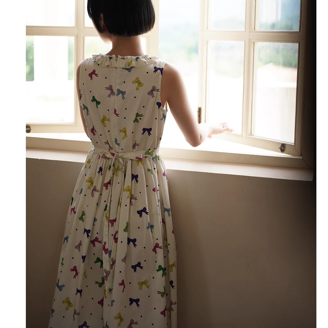 カラフルなリボン柄のレトロガーリーなノースリーブワンピース。