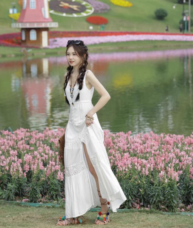 ボヘミアンなロングスカートが女性らしさを引き立て、Vネックデザインが華やかな印象を演出します。紐ベルト付きでウエストをキュッと引き締めてくれるため、スタイルアップ効果も期待できます。カラーはホワイト、ブレー、レッドの3色展開で、お好みのコーディネートに合わせてお選びいただけます。