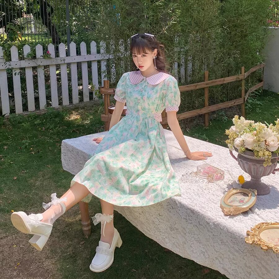 レディース 花柄 チェック柄 半袖 バックリボン ロングワンピース S M グリーン AS11353