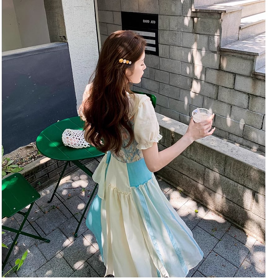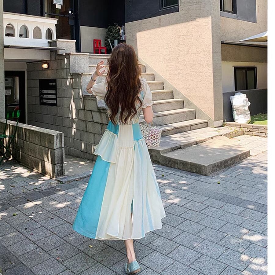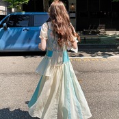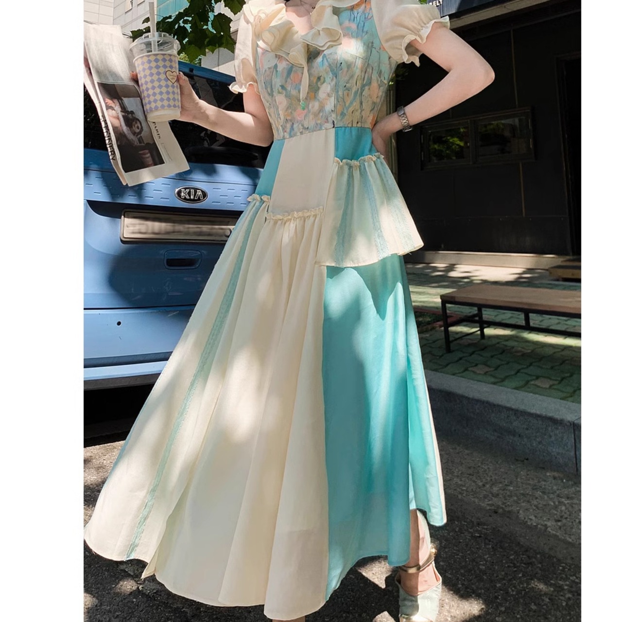 レディース 半袖 ロングワンピース フリル 花柄 S M L ブルー アプリコット フレンチレトロ AS11366