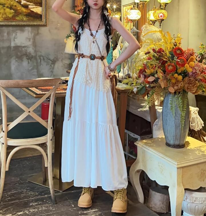 レディース ノースリーブ サスペンダースカート ワンピース ボヘミアン ロングスカート エスニック ドレス ベスト 紐ベルト付き 3点セット KS10397