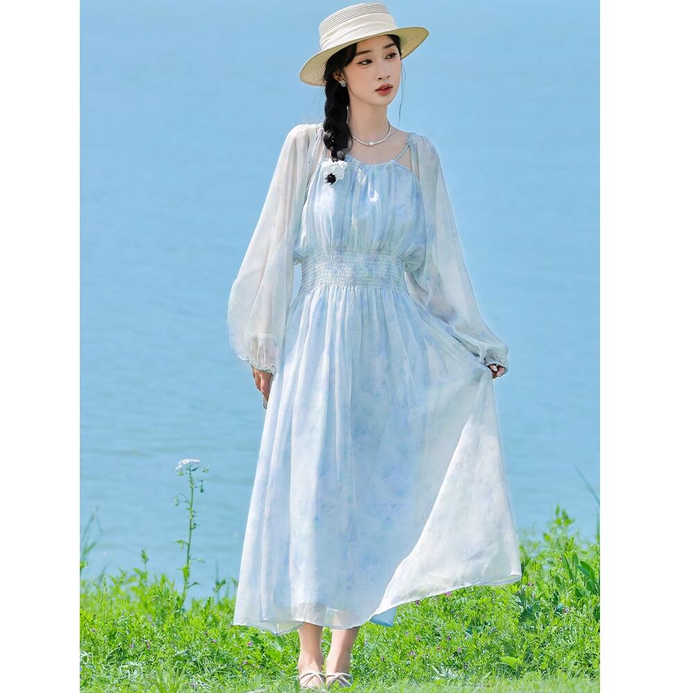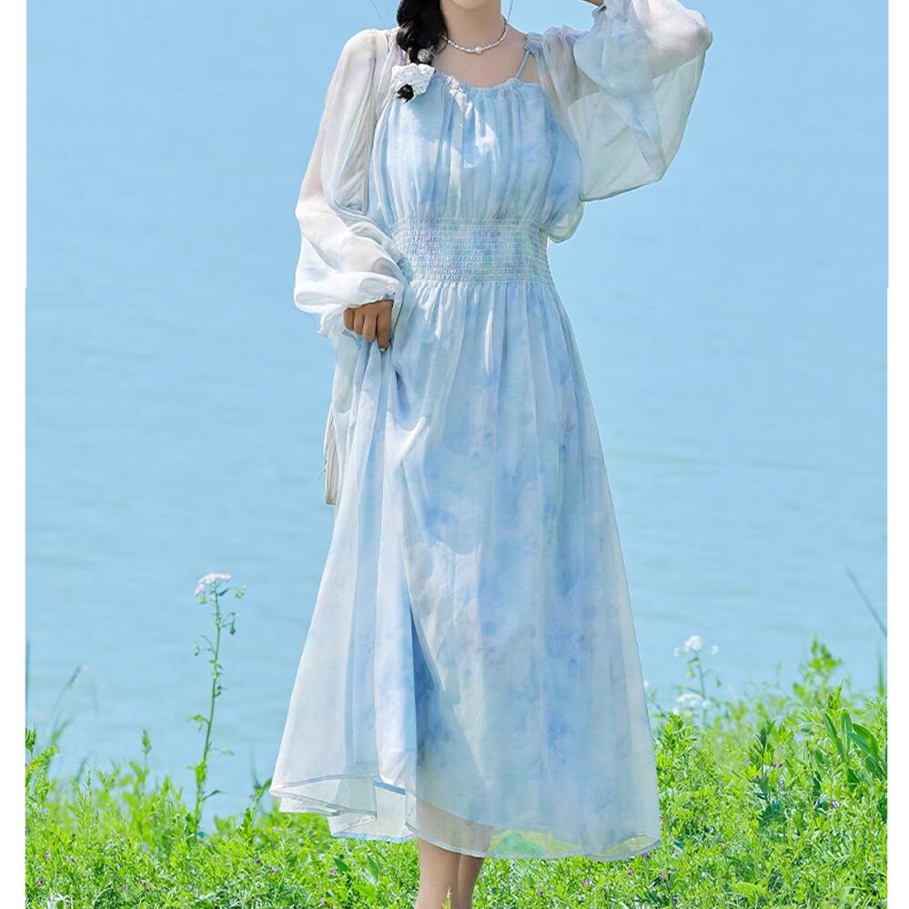 レディース ロング丈 ワンピース 袖シアー S M L ブルー AS11376