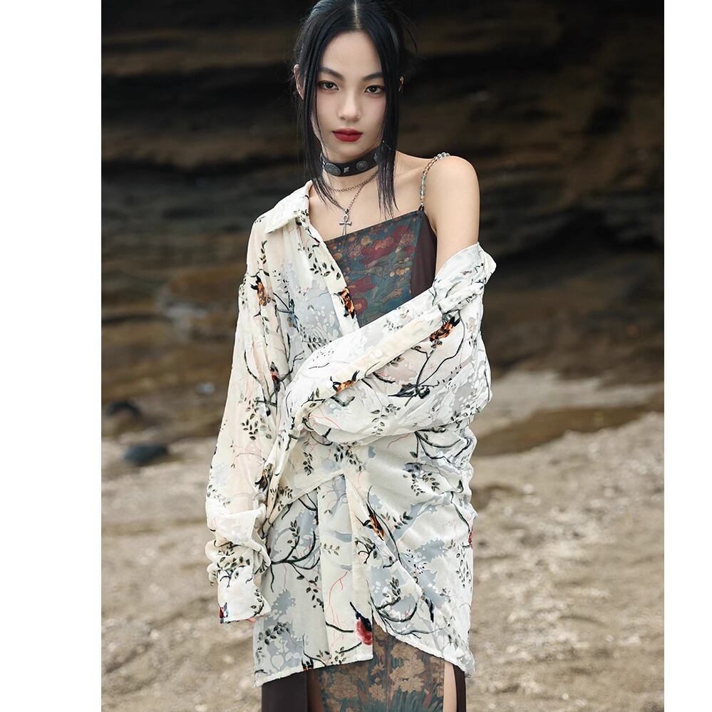 レディース 長袖 鳥柄 シャツ トップス 薄手 中国風 アプリコット AS11381