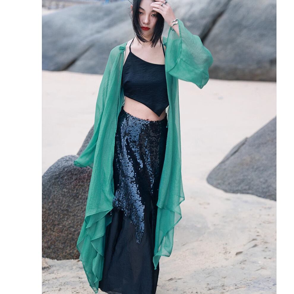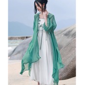 レディース カーディガン 長袖 トップス ロング丈 薄手 シアー グリーン AS11384