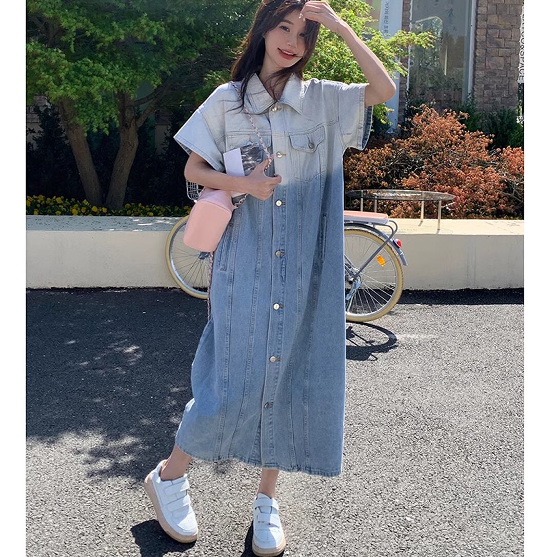 レディース 半袖 デニム ロングワンピース シャツワンピース S M L XL グラデーション AS11417