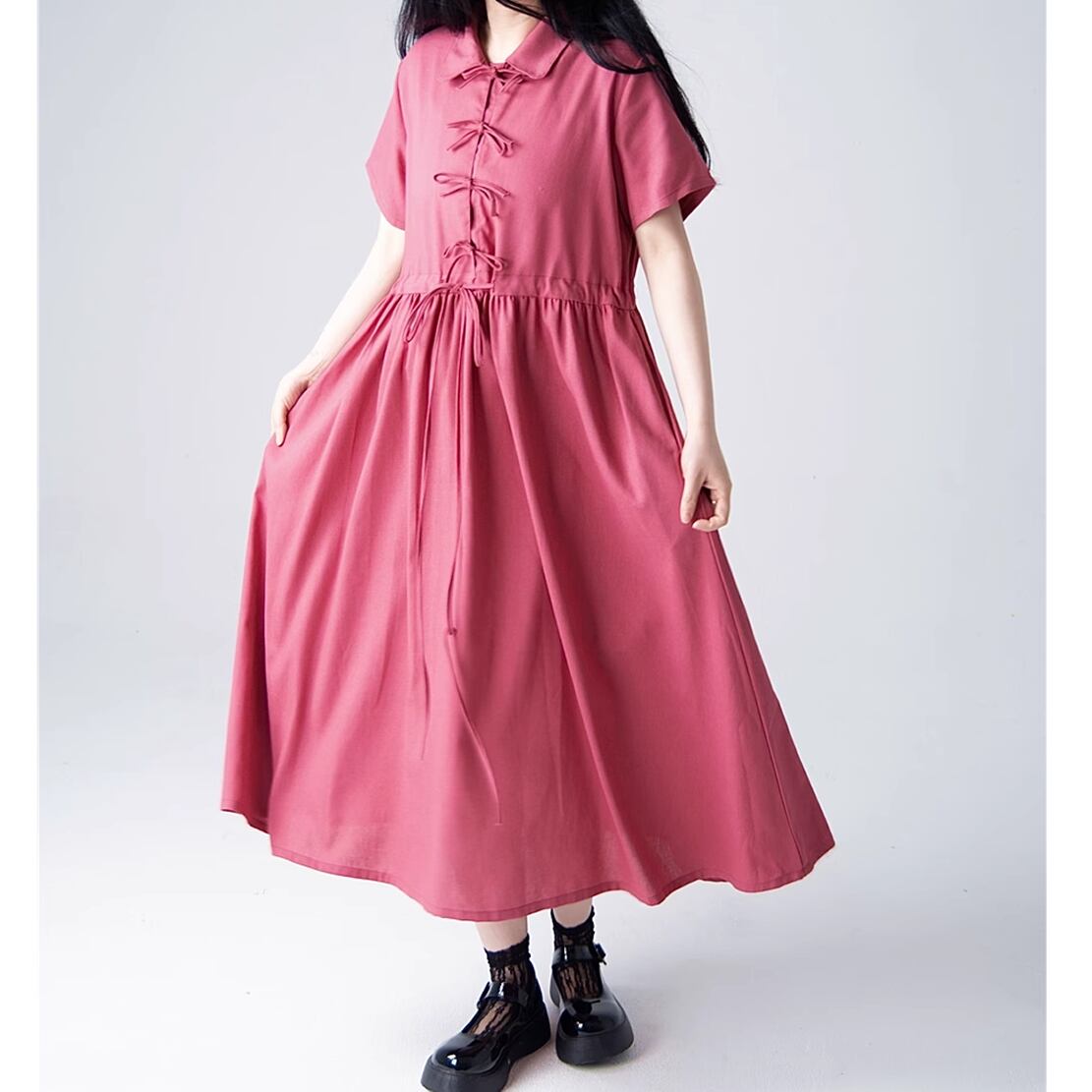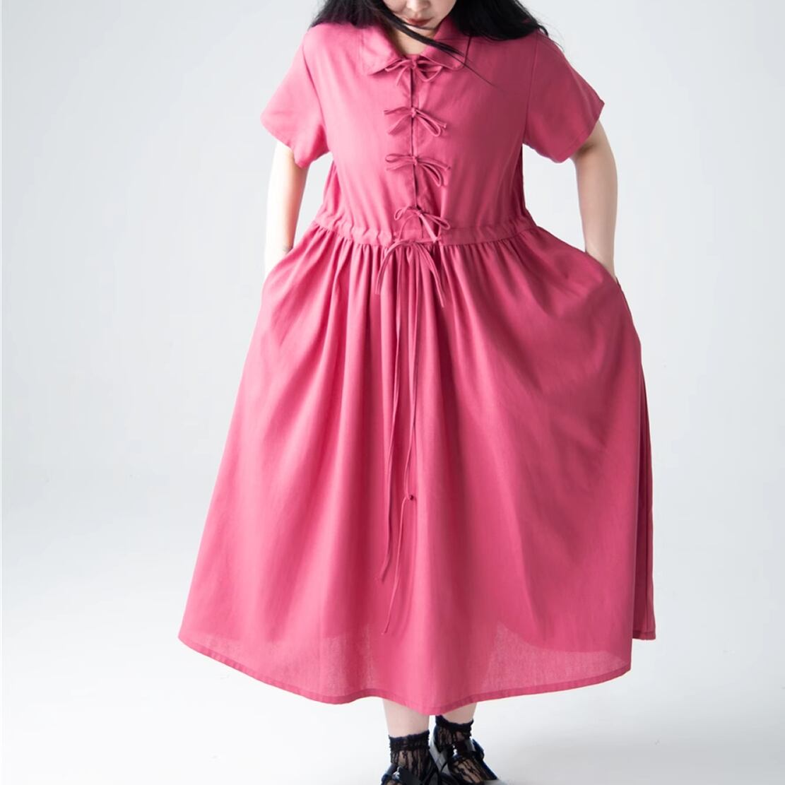 レディース 半袖 リボン ワンピース ロング丈 M L コットンリネン ピンク AS11427