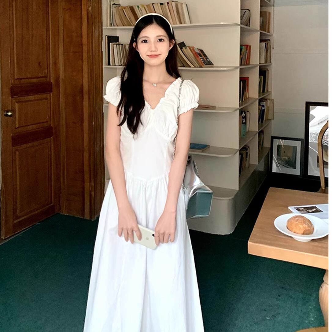 レディース 半袖 ワンピース フリル コットン vネック ロング丈 S M L 白 ホワイト ピンク AS11434
