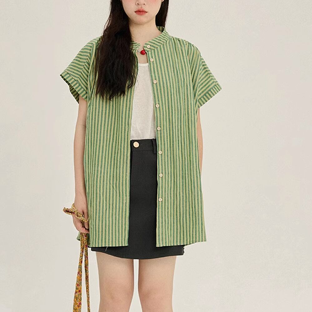 レディース ストライプ柄 半袖 シャツ S M 薄手 グリーン AS11445