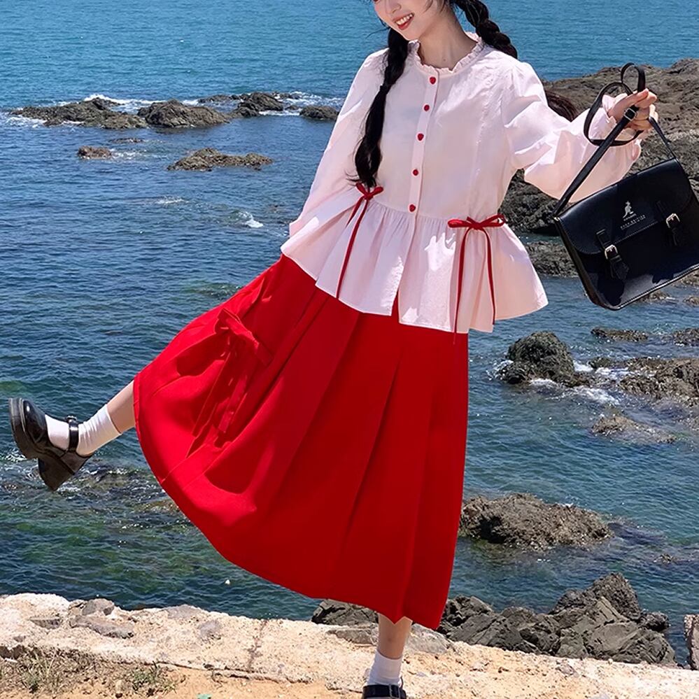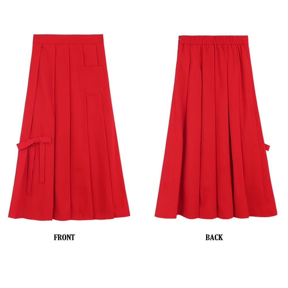 レディース プリーツスカート リボン ロング丈 S M 赤 レッド AS11451