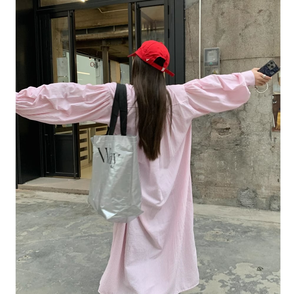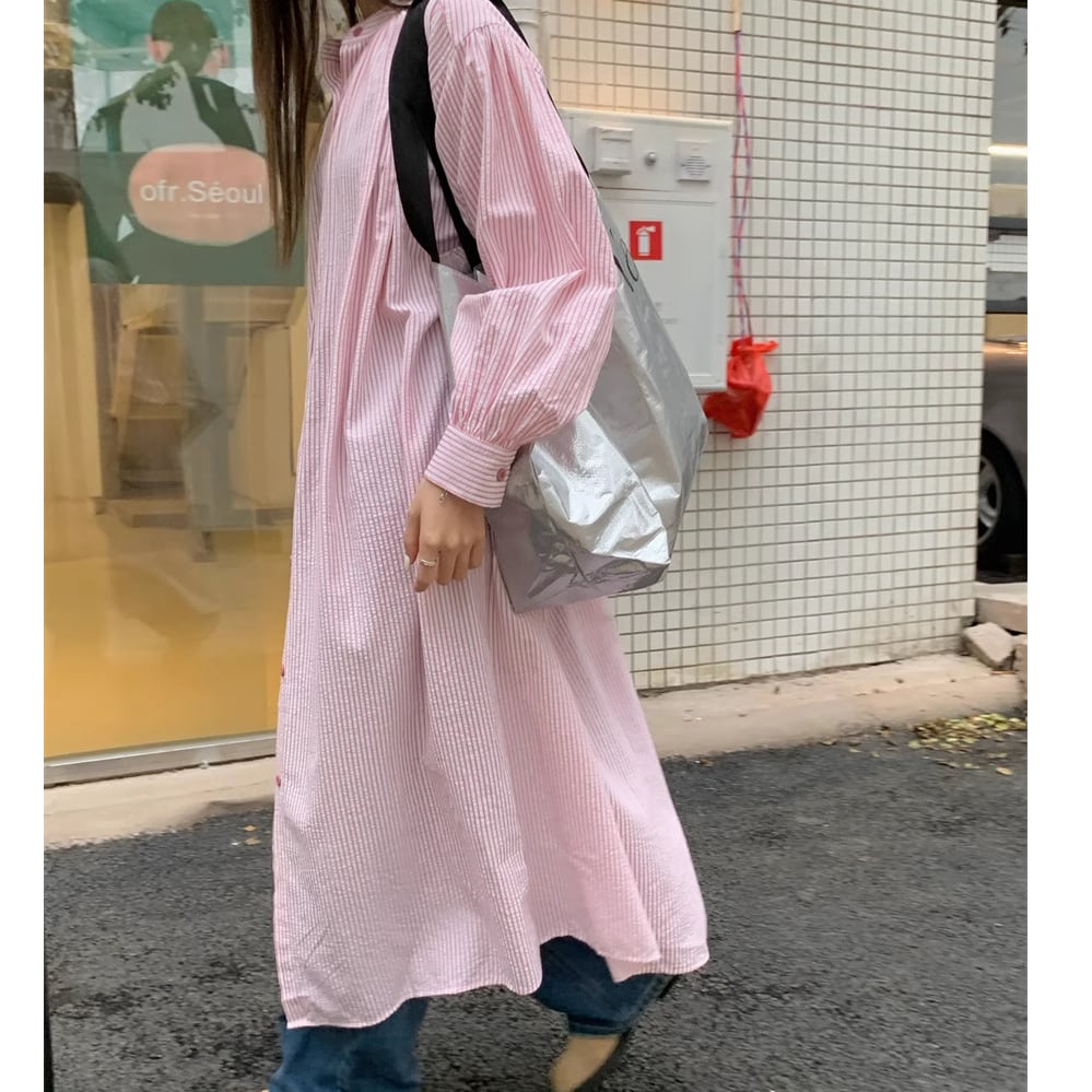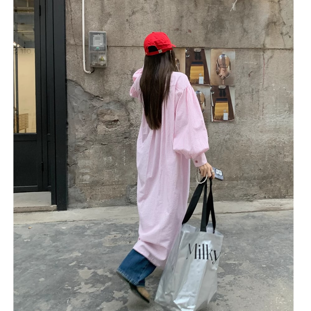 レディース 長袖 ストライプ柄 ロングシャツ 薄手 ピンク AS11455