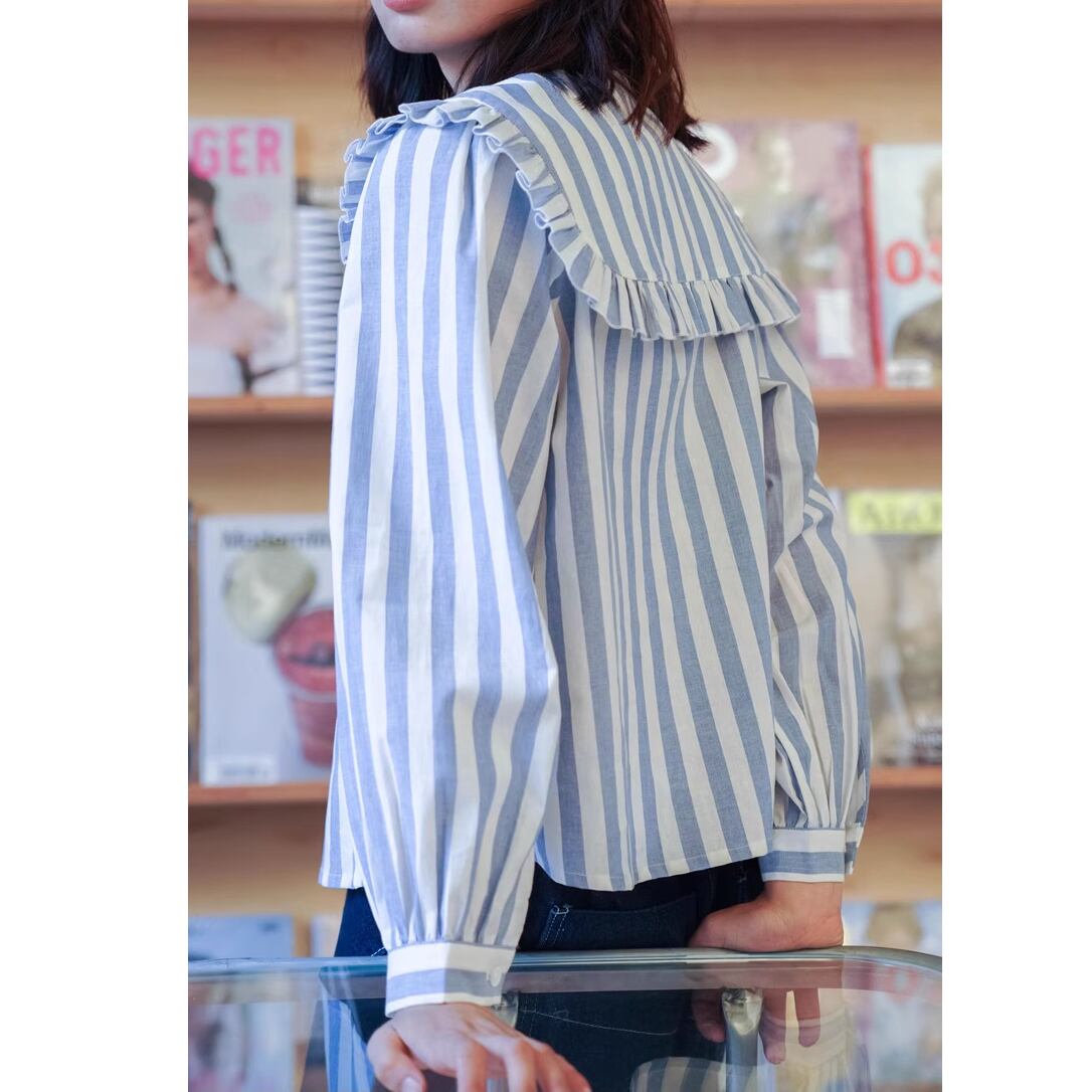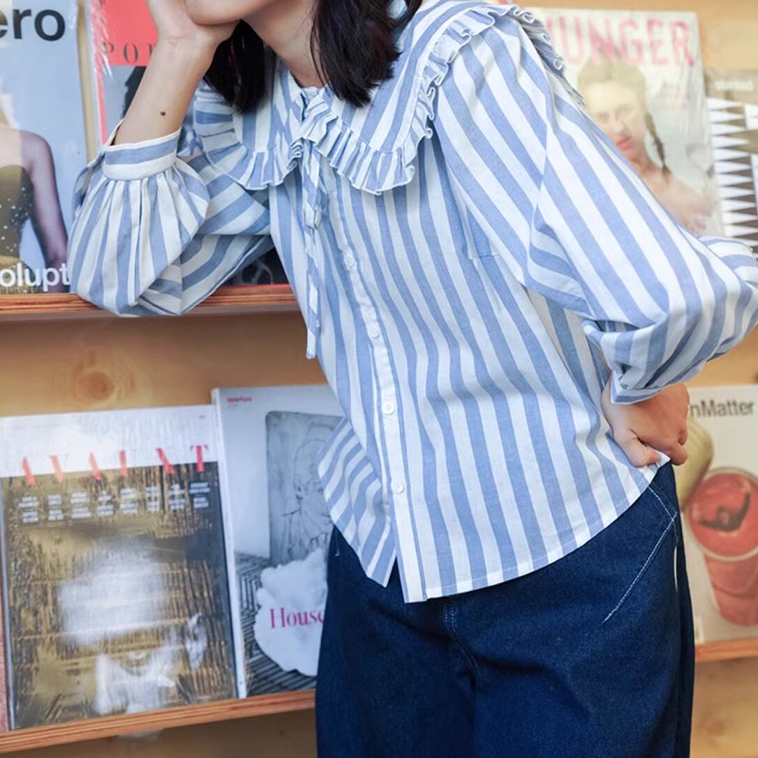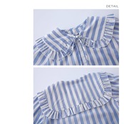 レディース フリル ビッグカラーストライプ柄 丸襟 ブラウス 長袖 M L ブルー AS11464